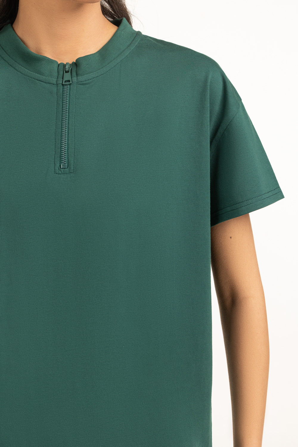 A statement piece for everyday wear, this loose-fit top combines a bold tone with a zipper neckline. Its relaxed cut keeps it comfortable, while the detail adds refined versatility. A functional choice that transitions smoothly through the season.