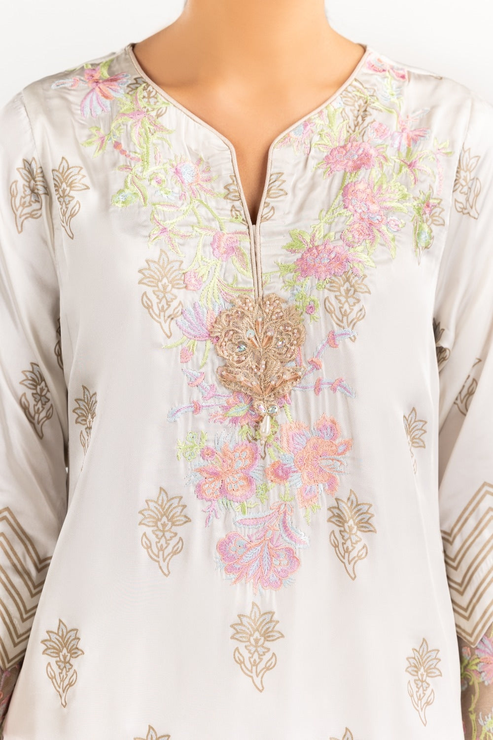 Ready to wear Off white polyester silk screen printed and embroidered shirt with gold tissue embroidered borders on daman and sleeves. Embellished with hand touched brouche on neckline.