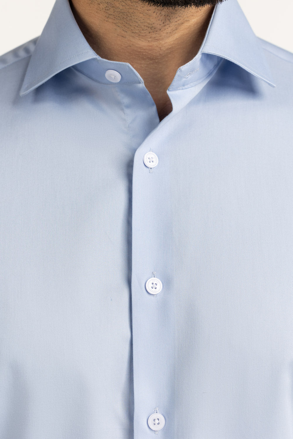 Elevate your formal style with this men’s plain dress shirt, designed for a sharp and contemporary appearance. Tailored in a modern fit, it offers a clean, well-defined silhouette ideal for professional and formal settings. Crafted from 100% cotton and enhanced with a liquid ammonia finish (LA Finish), the fabric delivers a silky sheen, improved durability, and a smooth, refined look. The treatment also enhances softness and helps the shirt retain its shape after wear and wash. Perfect to pair with dress pants or suits, this shirt is a versatile essential for a sleek, confident, and polished formal wardrobe