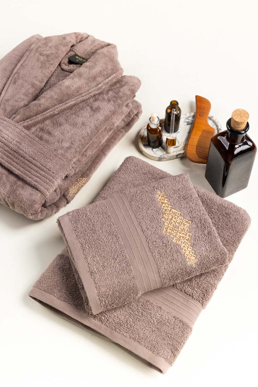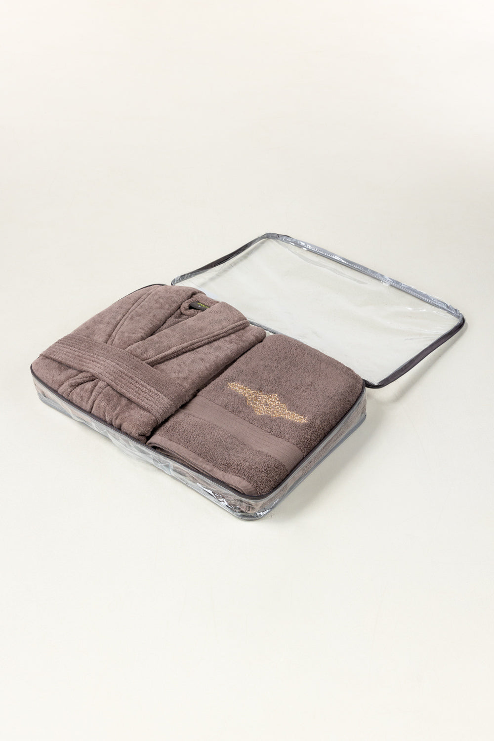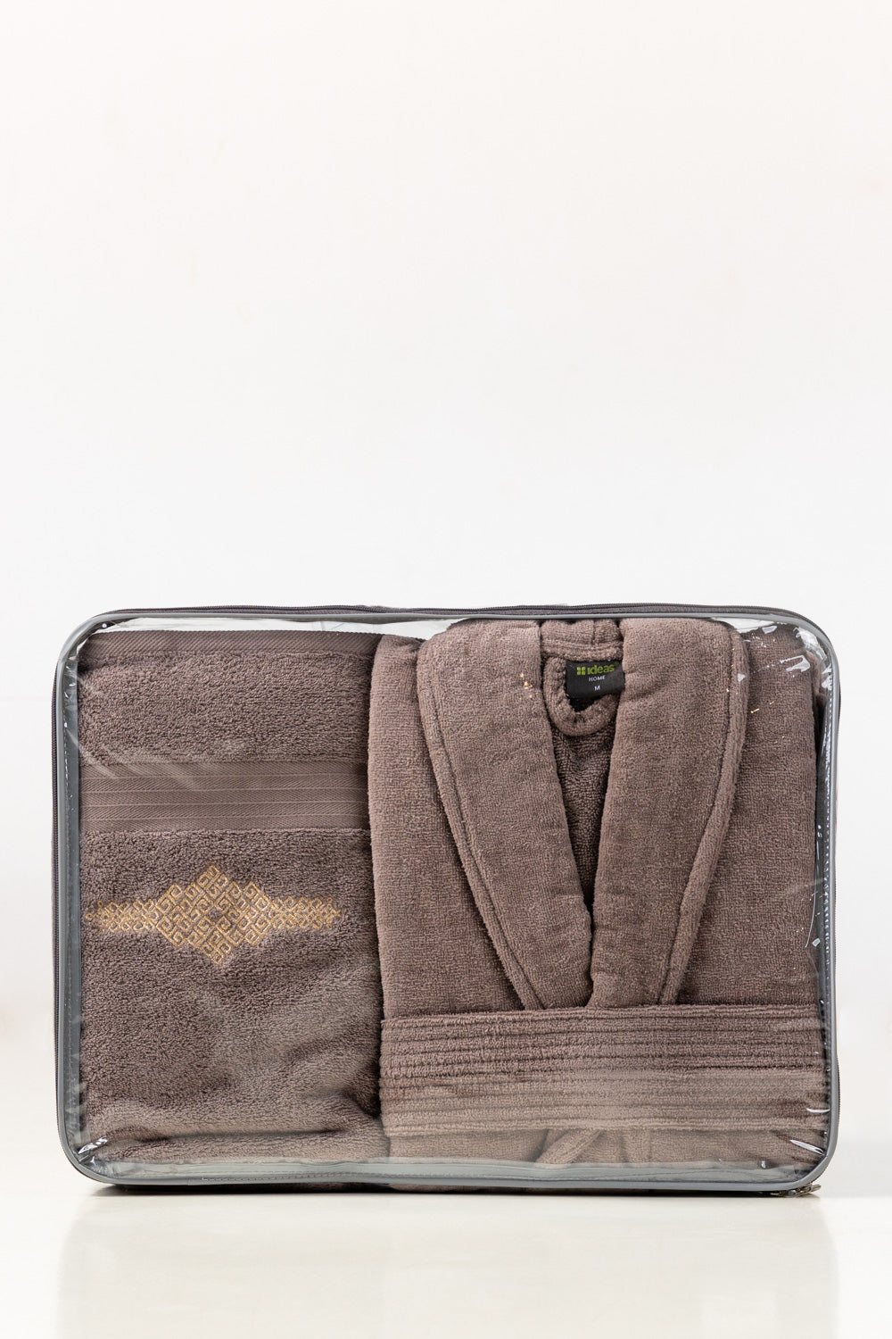 The gift box bath linen set is luxury in a box. Featuring a tailored weave border with lurex embroidery, the luxurious bathrobe included in the set has a premium quality velour exterior, giving a wonderful velvety feel and a 100% cotton toweling interior ensuring quick absorbency.