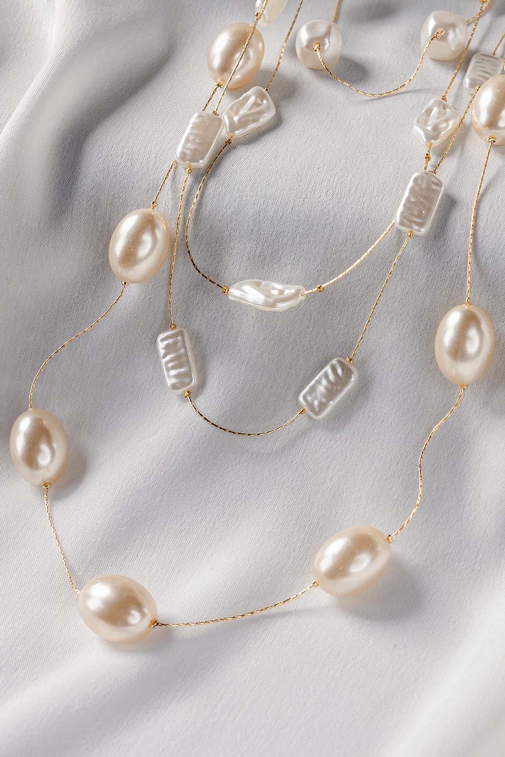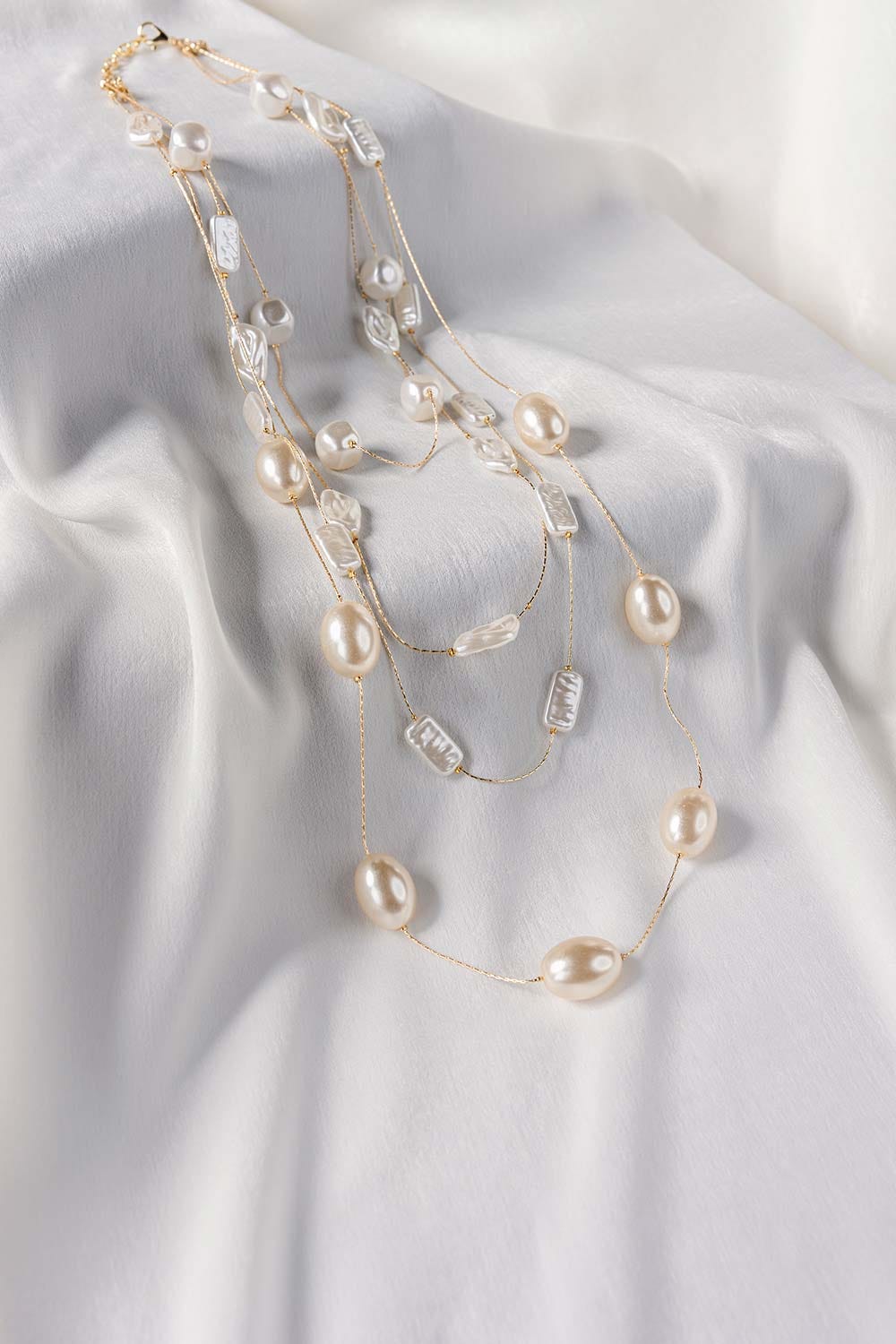 A multi-layer beaded necklace with white stones and beads on a gold thread chain. Layers of delicate beads cascade gracefully, each strand adorned with milky white gemstones that shimmer like moonlight.