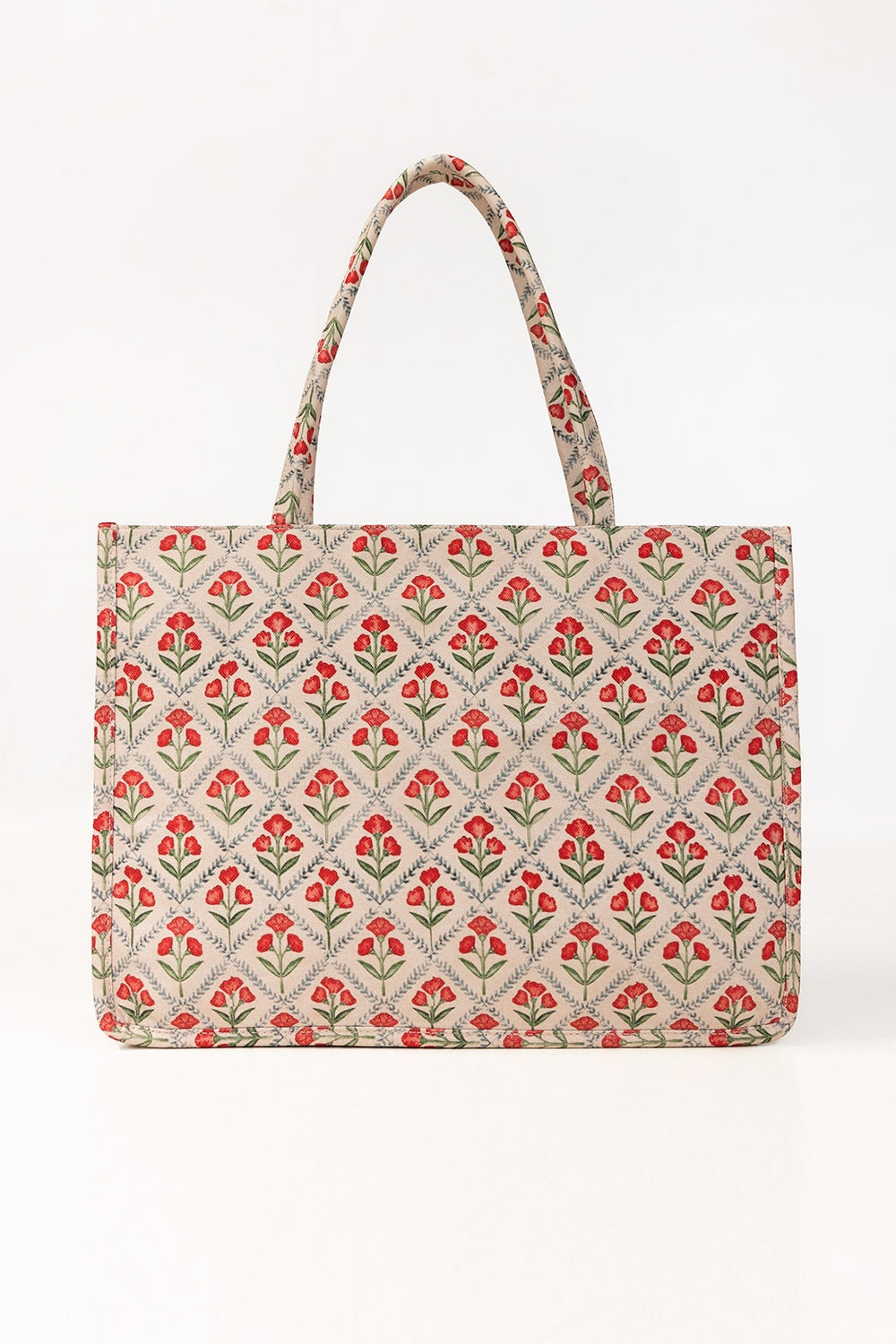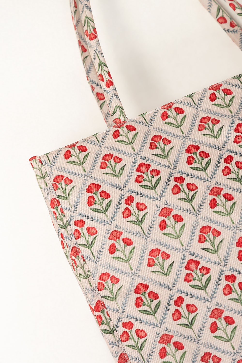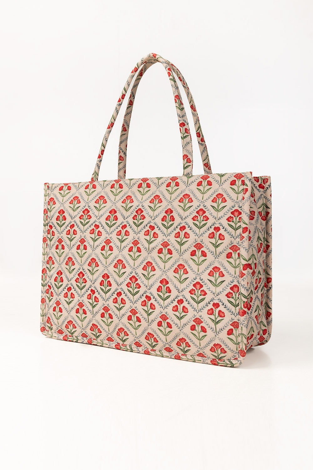 Infuse your day with a touch of artistry and elegance with this canvas tote bag. Featuring a timeless block-printed floral design, this tote combines traditional craftsmanship with modern practicality. The neutral beige canvas provides a versatile backdrop, while the intricate floral print adds a unique, handcrafted touch. With ample space to carry your daily essentials, this durable tote is perfect for everything from shopping trips to beach days or casual outings.