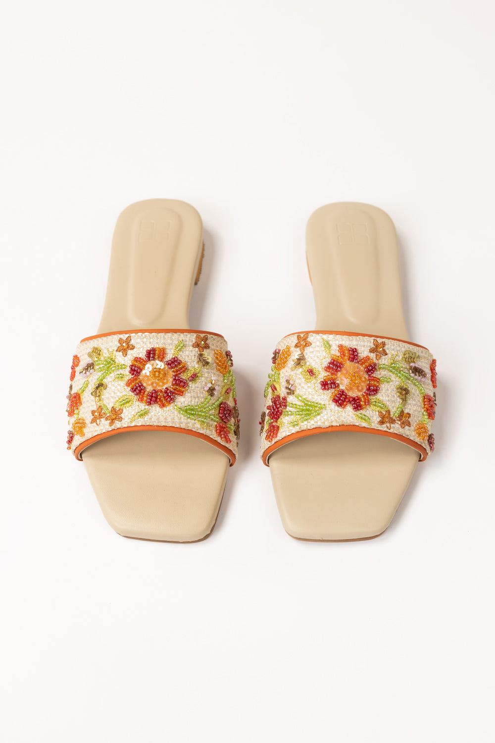 Add a touch of charm to your everyday look with these elegant floral slide sandals. Featuring intricate hand-beaded embroidery in vibrant hues on beige base, they offer the perfect blend of style and comfort. Pair them with dresses, denim, or festive outfits for a chic, statement finish.