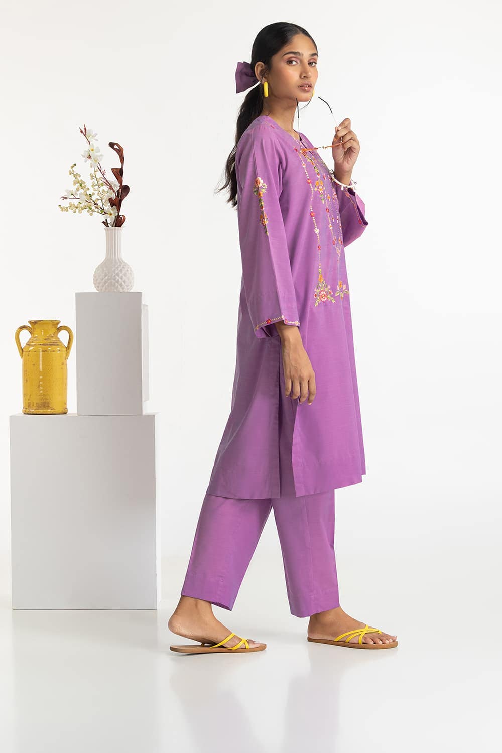 Ready to wear This elegant purple Embroidered Co-Ord Set features intricate floral embroidery along the neckline and sleeves. The comfortable fit and vibrant color make it perfect for any occasion.