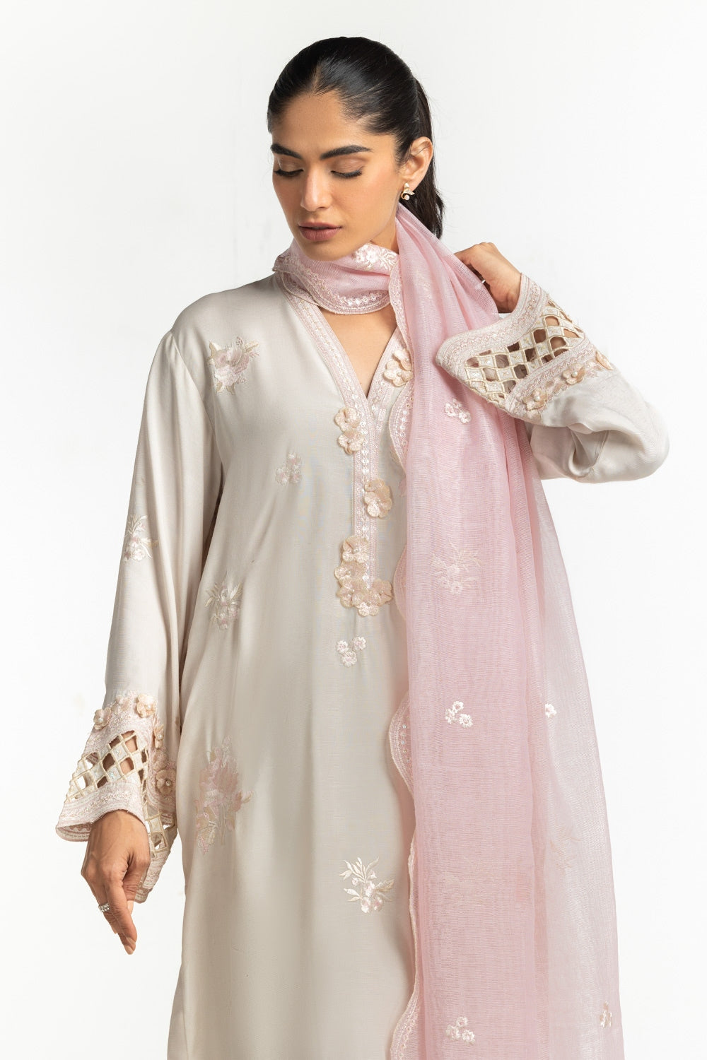 Featuring a delicate floral embroidery in a soothing pink hue, this dupatta brings a contemporary twist to your traditional festive wear. While the breathable fabric makes it ideal for summer events, offering comfort and style all day long.