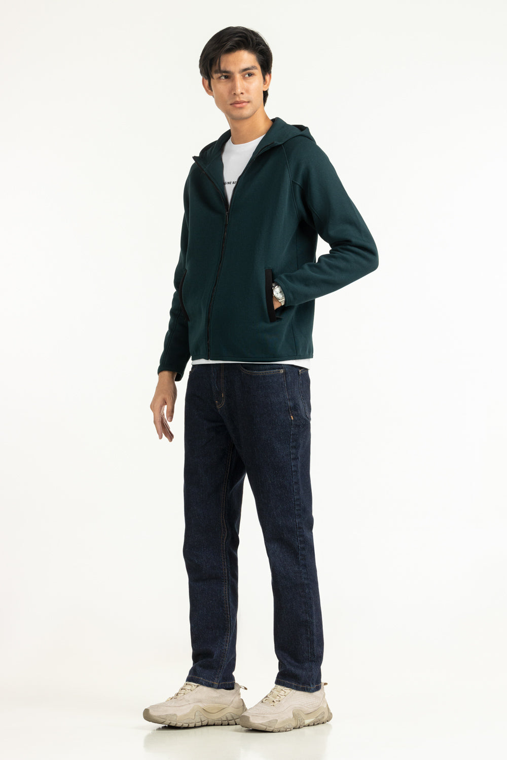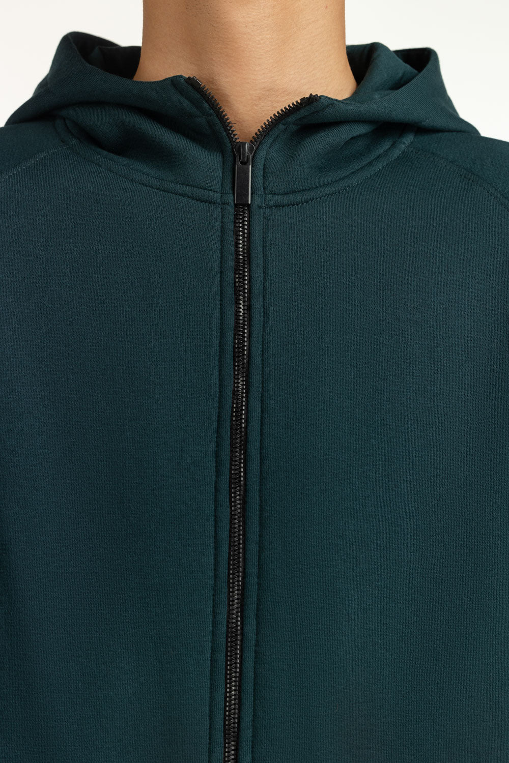 This hooded zipper in a dark sea green hue is a fusion of unmatched comfort and contemporary style. The regular fit ensures balance between structure and ease, while the clean zipper line keeps the design sharp and effortless.