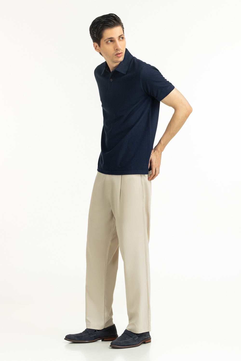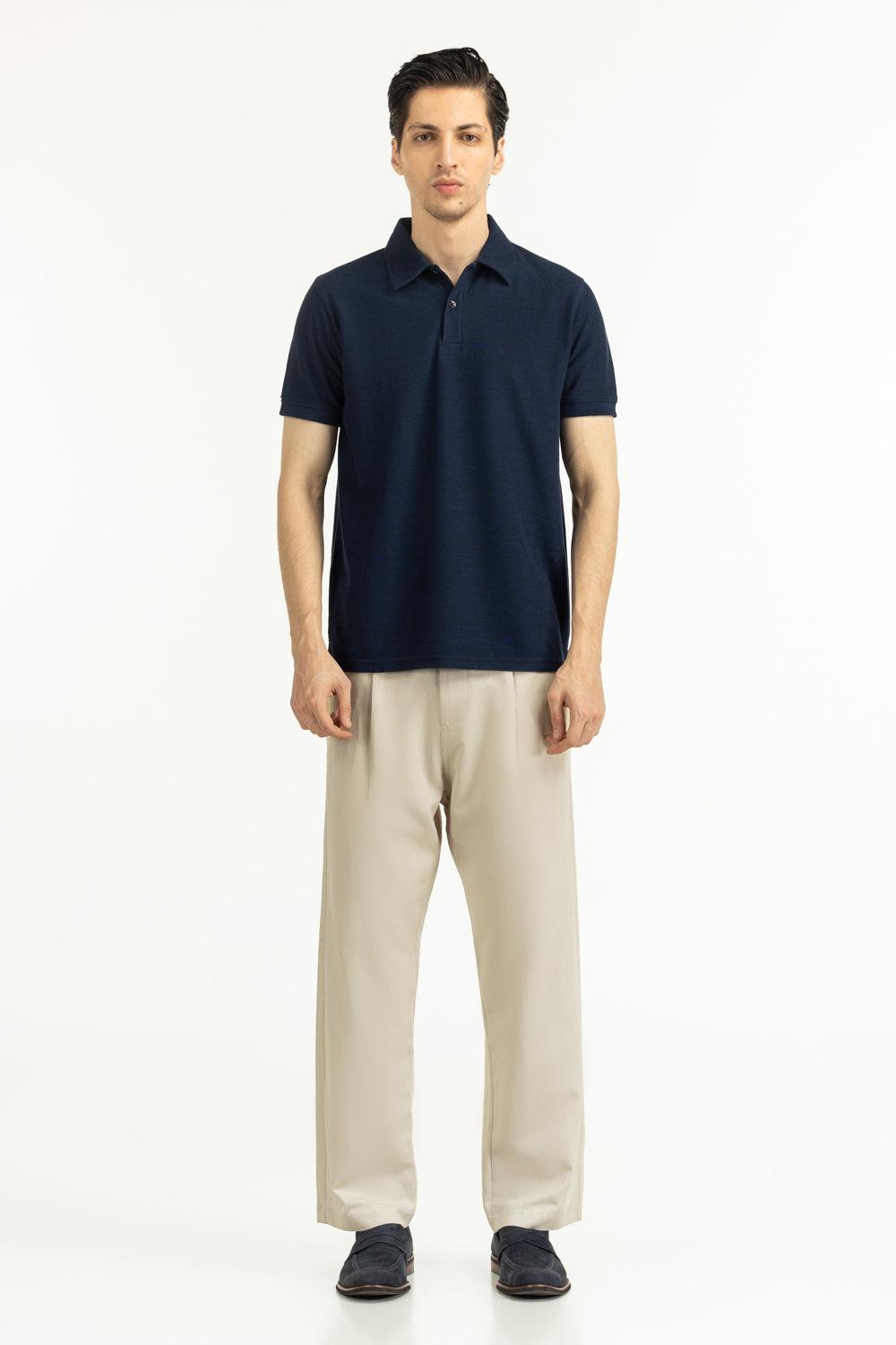 Designed in a rich Prussian blue, this textured polo blends structure and softness for everyday versatility. The regular fit ensures ease of movement, while the button neckline adds a refined touch.