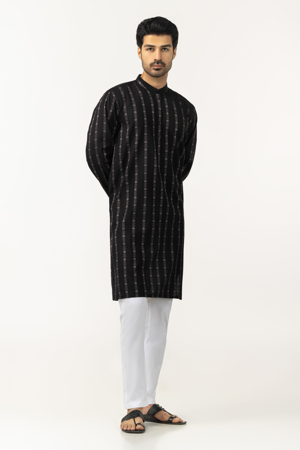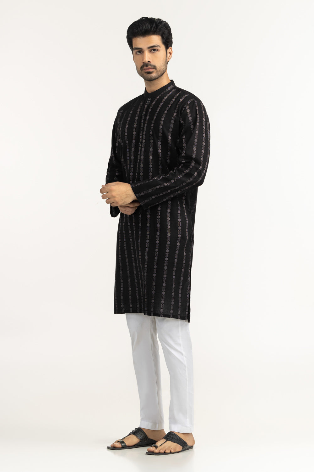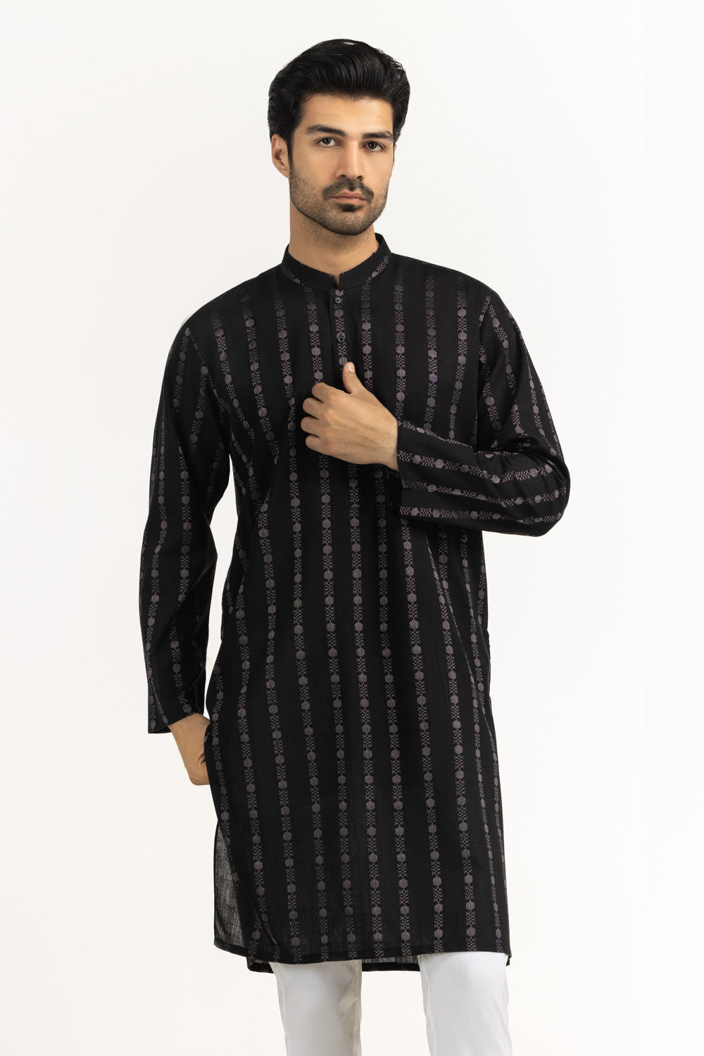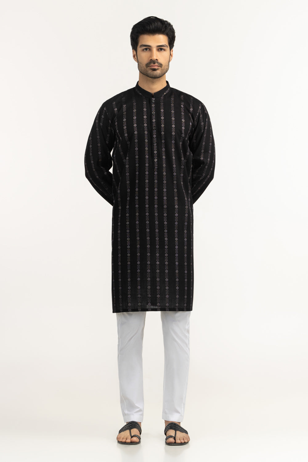 Constructed using soft and breathable 100% cotton fabric, this regular fit kurta offers a clean traditional structure with comfortable daily wear ability. The classic black color highlighted within the design tone enhances its timeless ethnic presence.