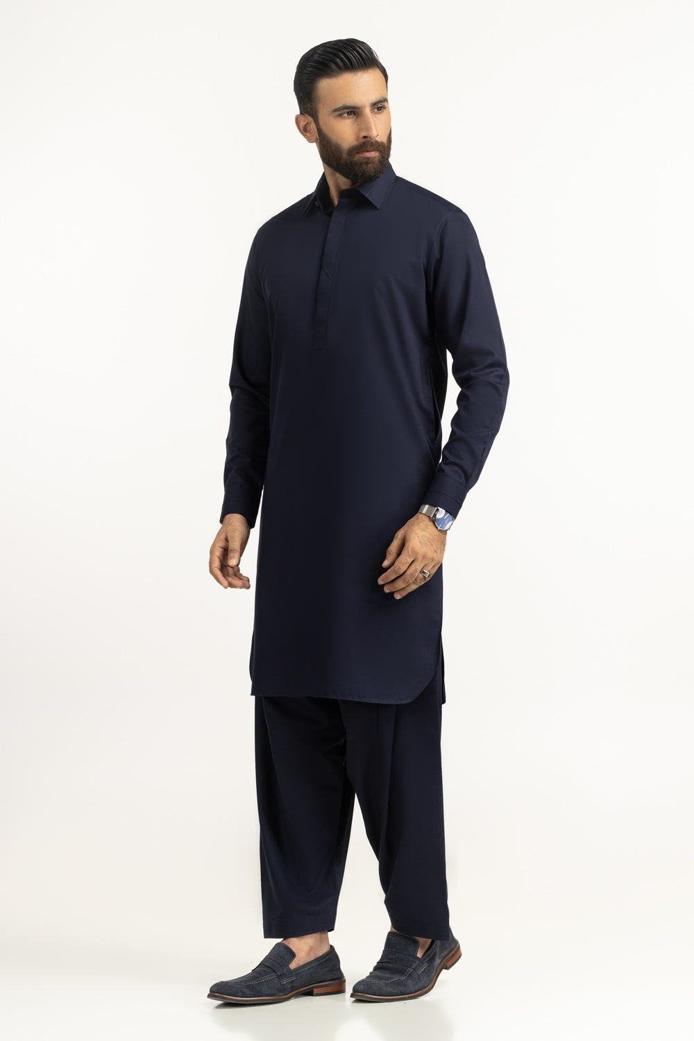 Experience unmatched refinement with the President Suit, crafted for those who appreciate superior quality and timeless elegance. This premium suit is designed with fully hidden stitching at the collar, placket, cuffs, and pockets, creating a seamless, uninterrupted finish that reflects true craftsmanship and attention to detail. The concealed construction delivers a luxurious, refined, and distinguished look. Every element is carefully executed to achieve a smooth silhouette and a graceful drape, offering an elevated wearing experience that speaks of sophistication and prestige. Ideal for formal occasions, exclusive gatherings, and special moments, the President Collection Kameez Shalwar is a statement of class and distinction—an exceptional choice for men who demand excellence in traditional attire.