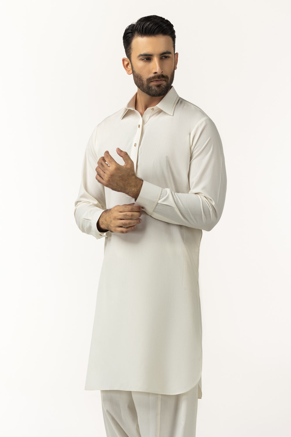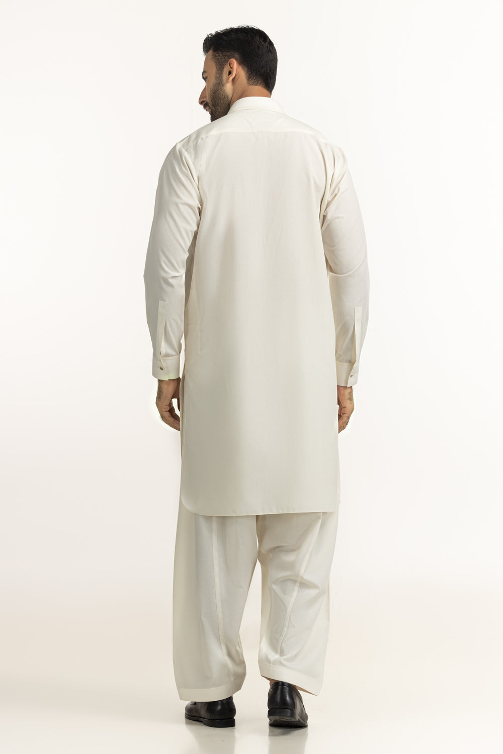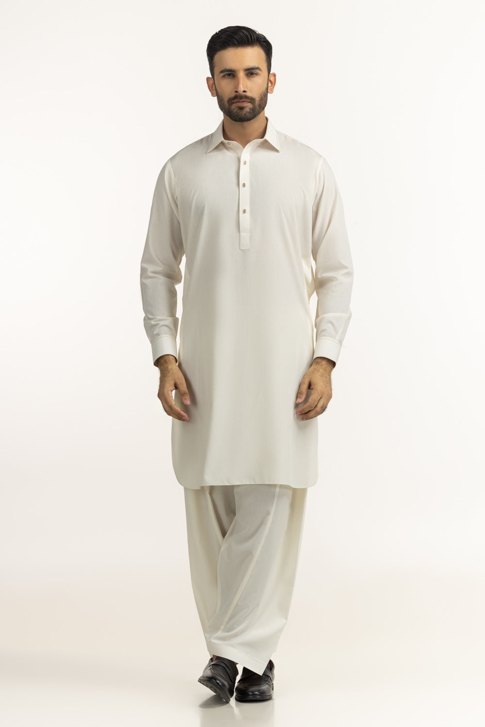 Crafted for a sophisticated ethnic look, this kameez shalwar features a stylish shirt collar paired with a gracefully rounded bottom hem. The cuffed sleeves enhance the polished appearance, offering a modern twist to a traditional silhouette. Perfect for festive occasions, family events, or smart casual wear, this ensemble delivers comfort, versatility, and understated luxury.