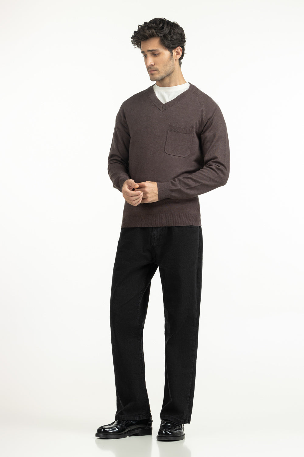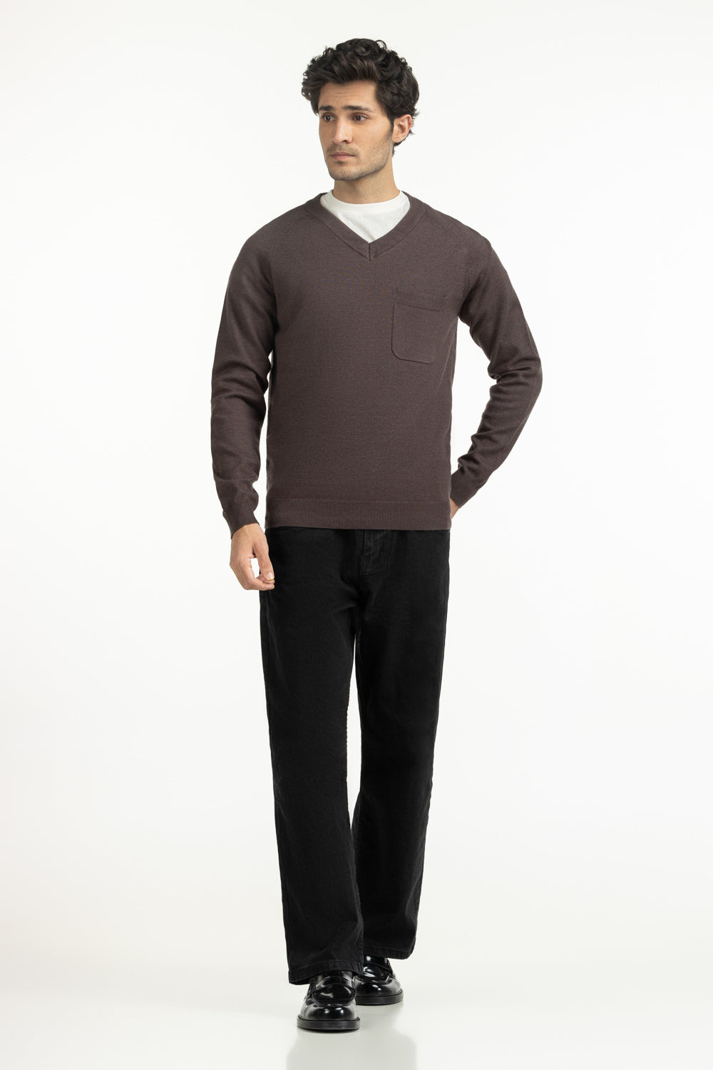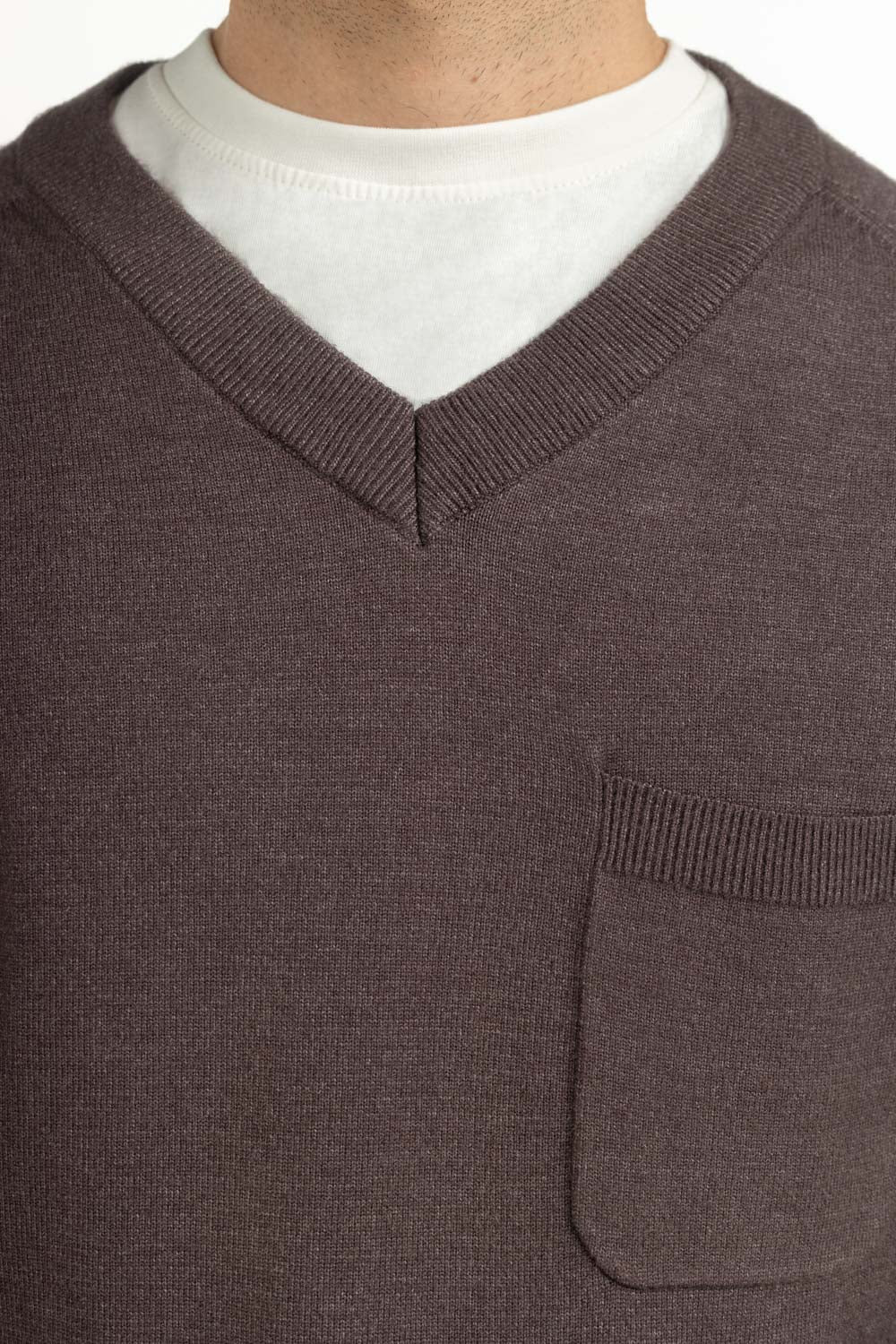 Lightweight and cozy, this sweater captures the essence of modern knitwear. Its V-neckline adds sophistication, complemented by the structured regular fit. A front pocket provides utility while giving the piece an understated edge. Rendered in soft grey hue, it transitions effortlessly between casual and semi-formal settings.