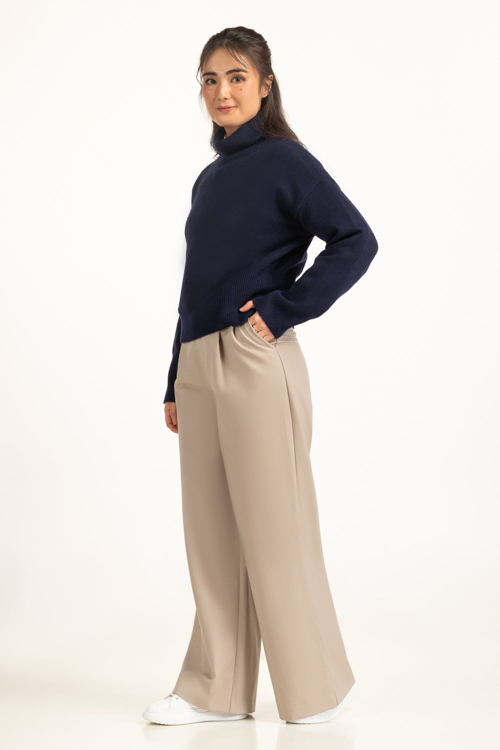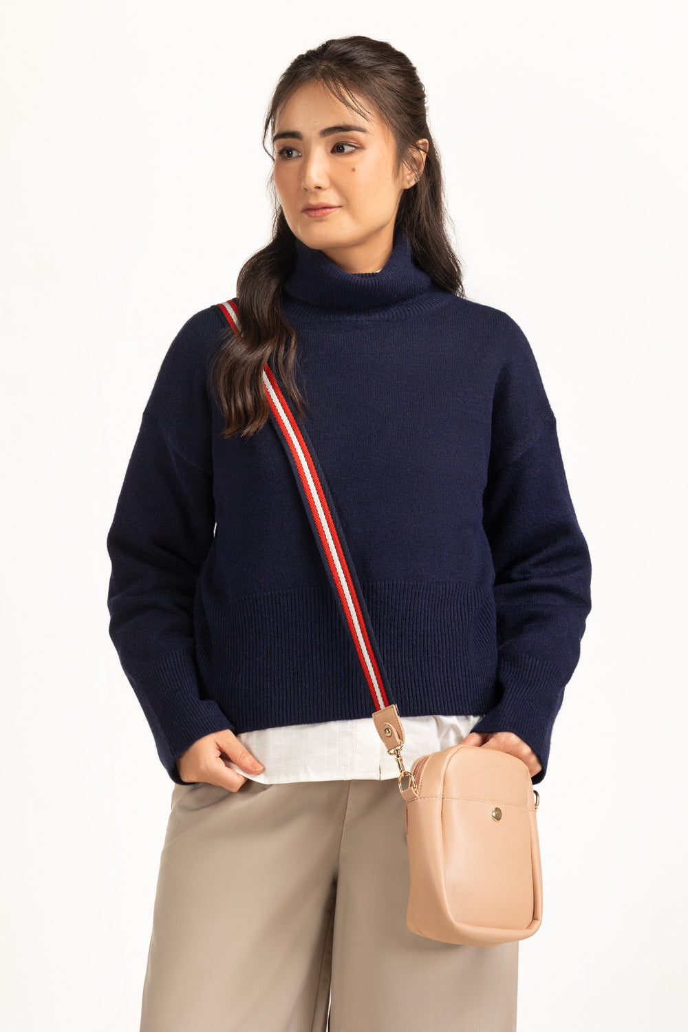 This sweater rewrites winter classics with contemporary aesthetics. The classic navy hue exudes quiet elegance, while the mock neck lends comfort and warmth. Its relaxed silhouette allows versatile styling without compromising structure.