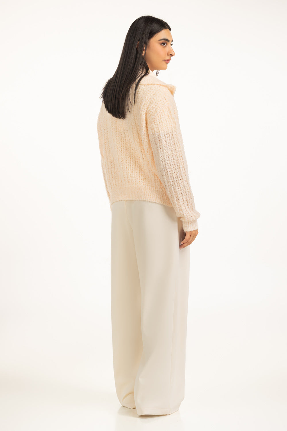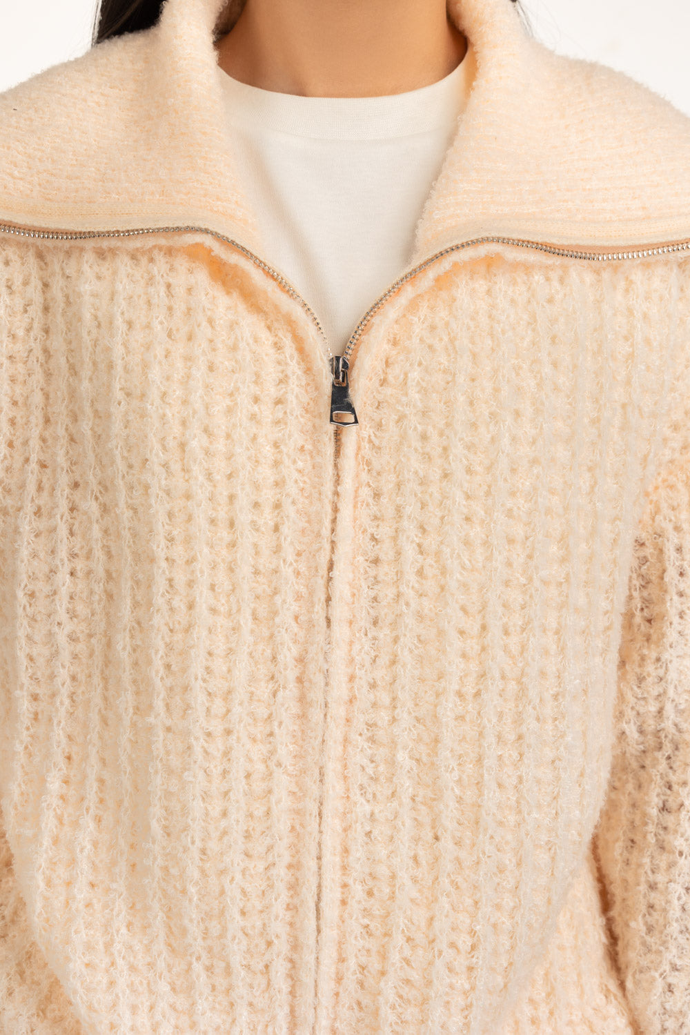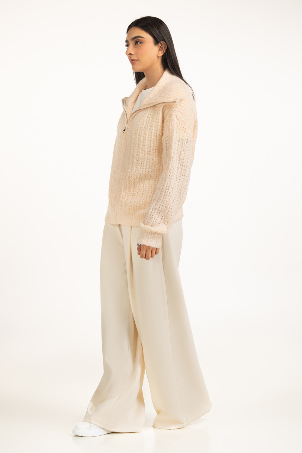 This beautiful light pink sweater redefines chic winter dressing. Its regular fit drapes naturally, allowing ease of movement with subtle sophistication. The structured collar pairs seamlessly with the zipper front. Carefully crafted with a feminine vibe for your winter wardrobe.
