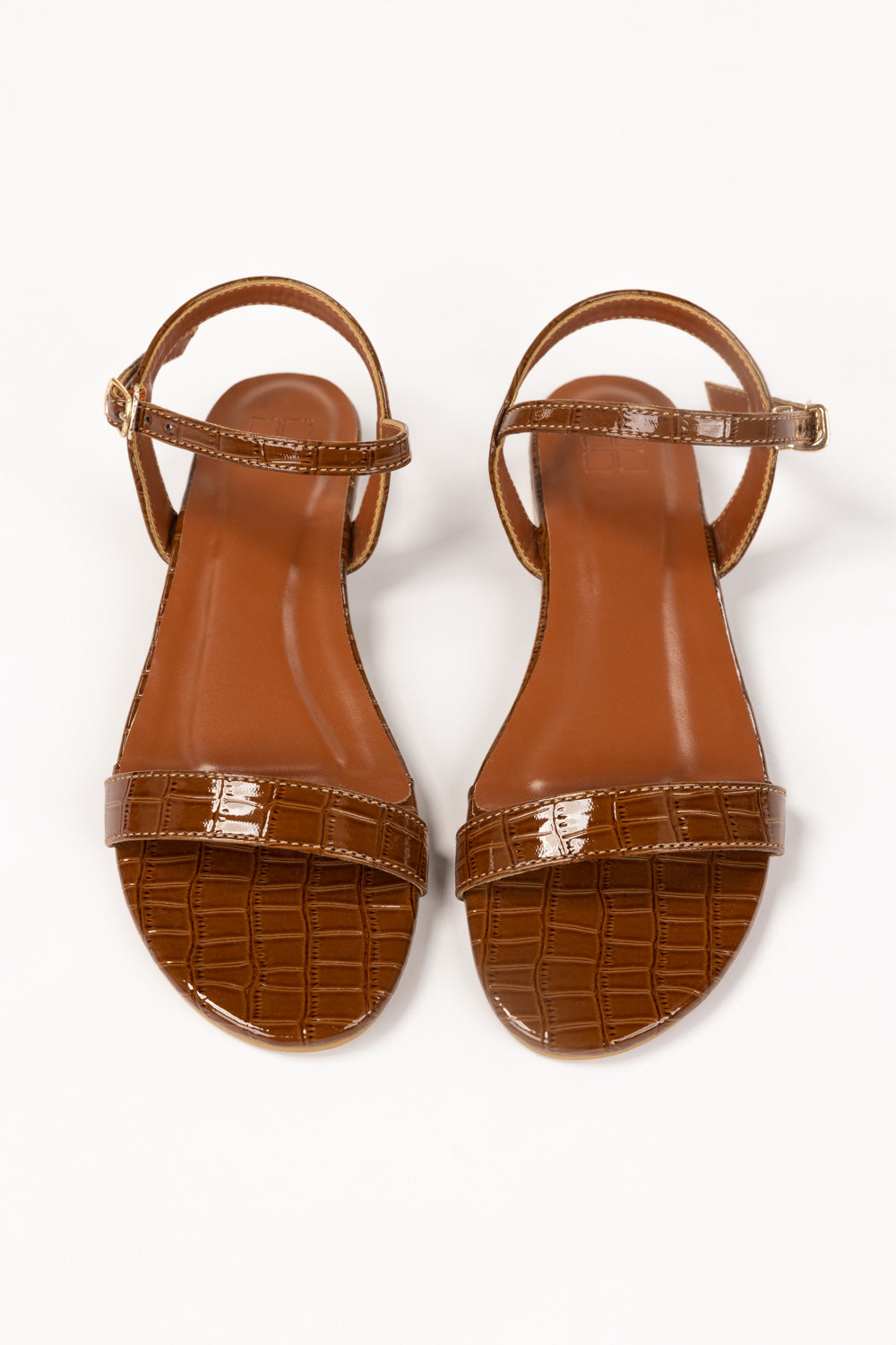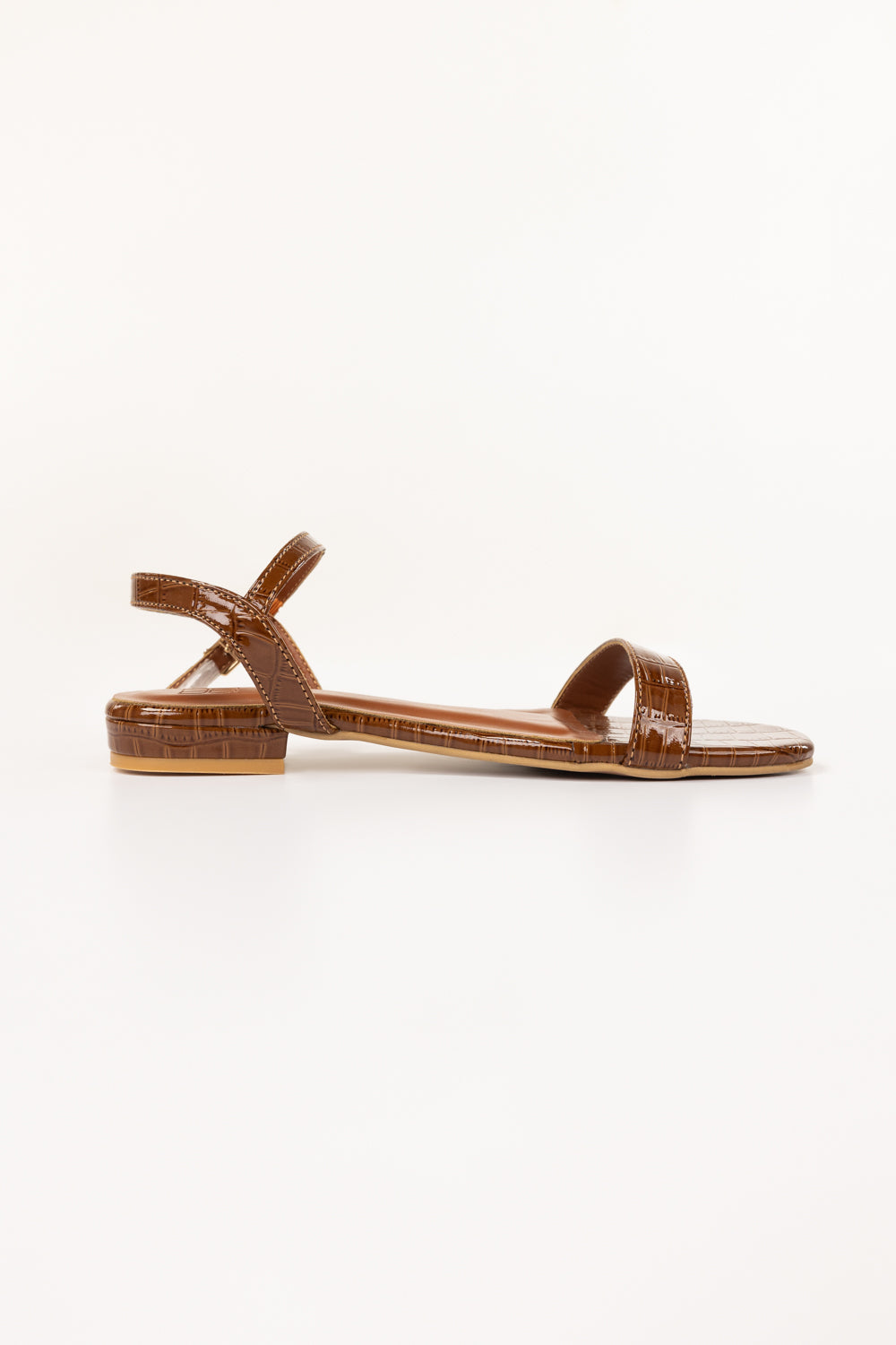 Elegant tan flat sandals with a glossy croc-embossed finish, designed with a minimalist toe strap and adjustable ankle strap, they offer both style and comfort, perfect for everyday or casual wear.