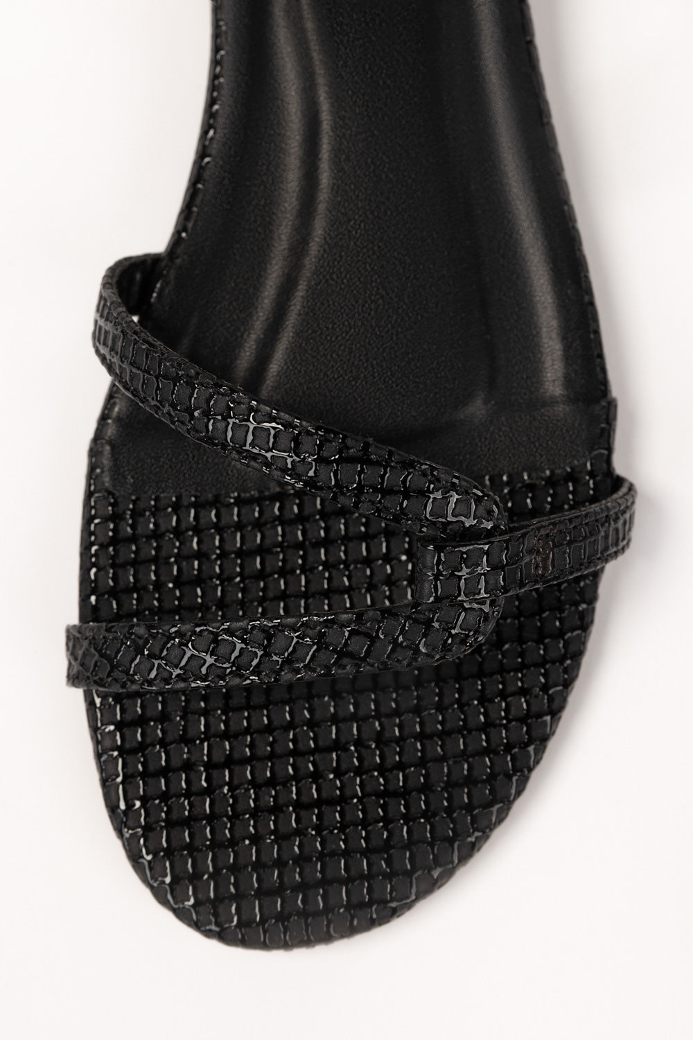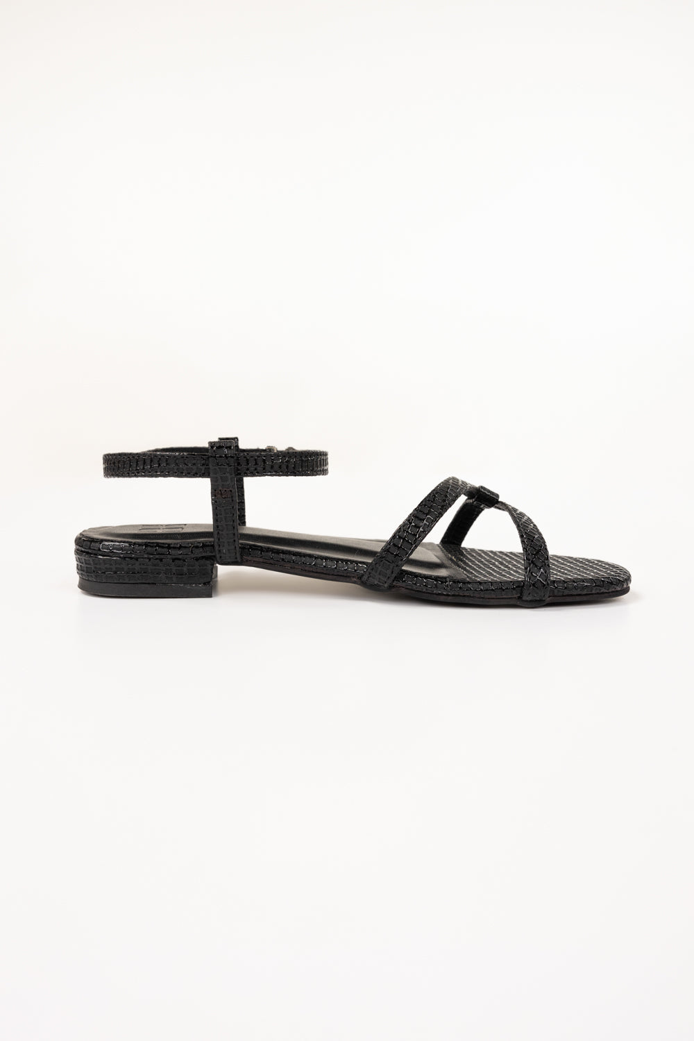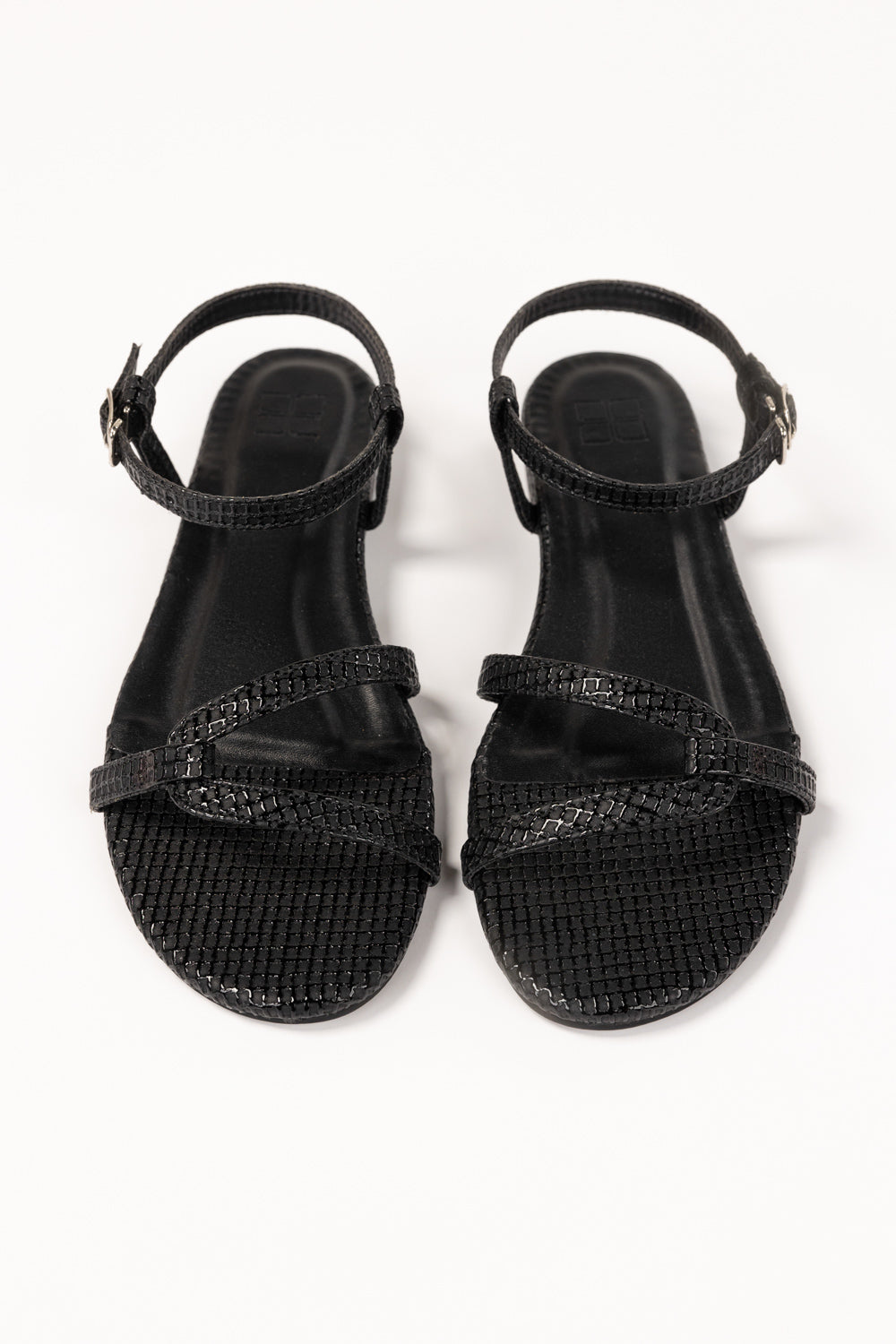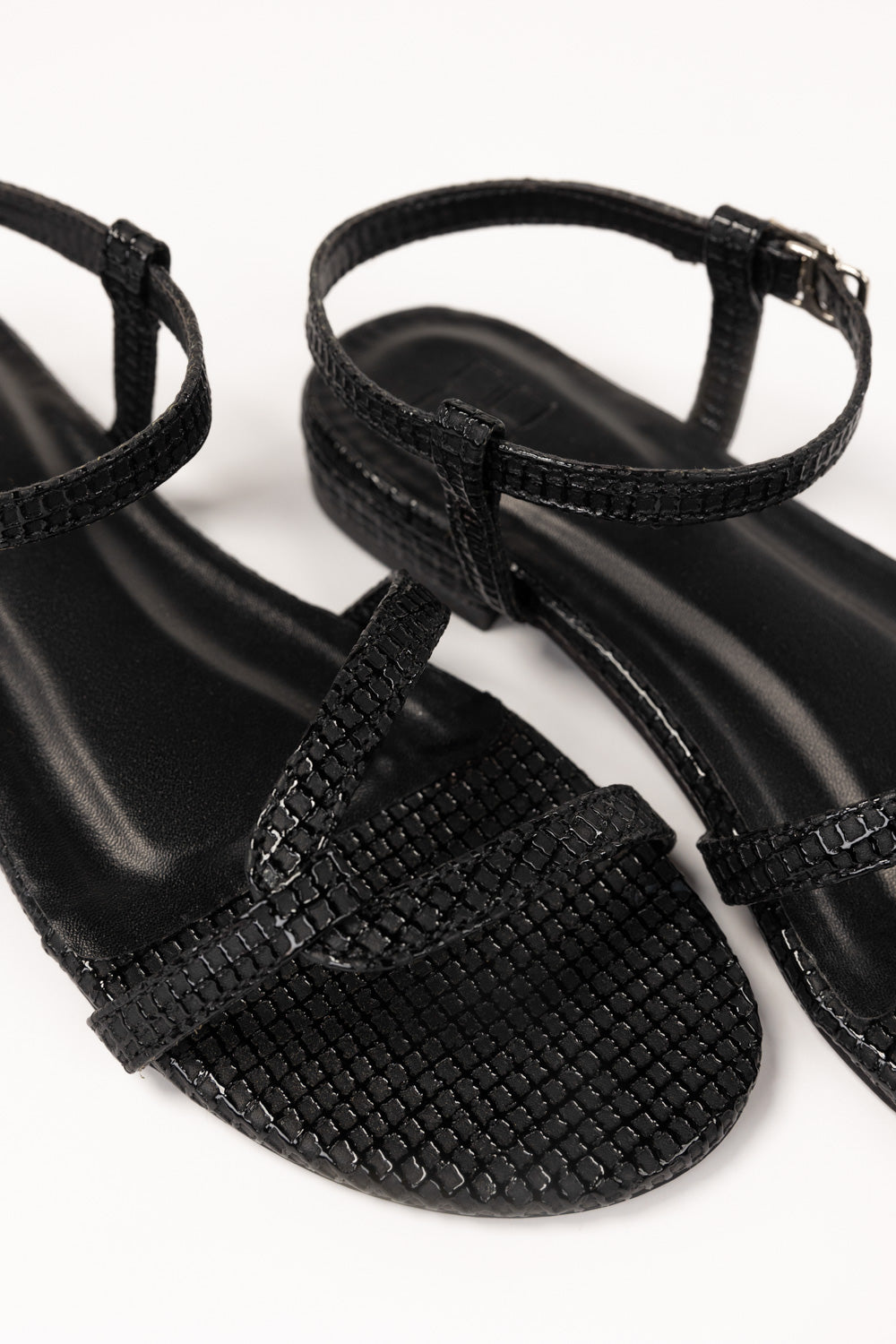 Sleek black flat sandals featuring a textured finish for a modern and versatile look. Designed with crossover toe straps and an adjustable ankle strap for secure, all-day comfort. Ideal for everyday wear, these sandals effortlessly complement both casual and semi-casual outfits.