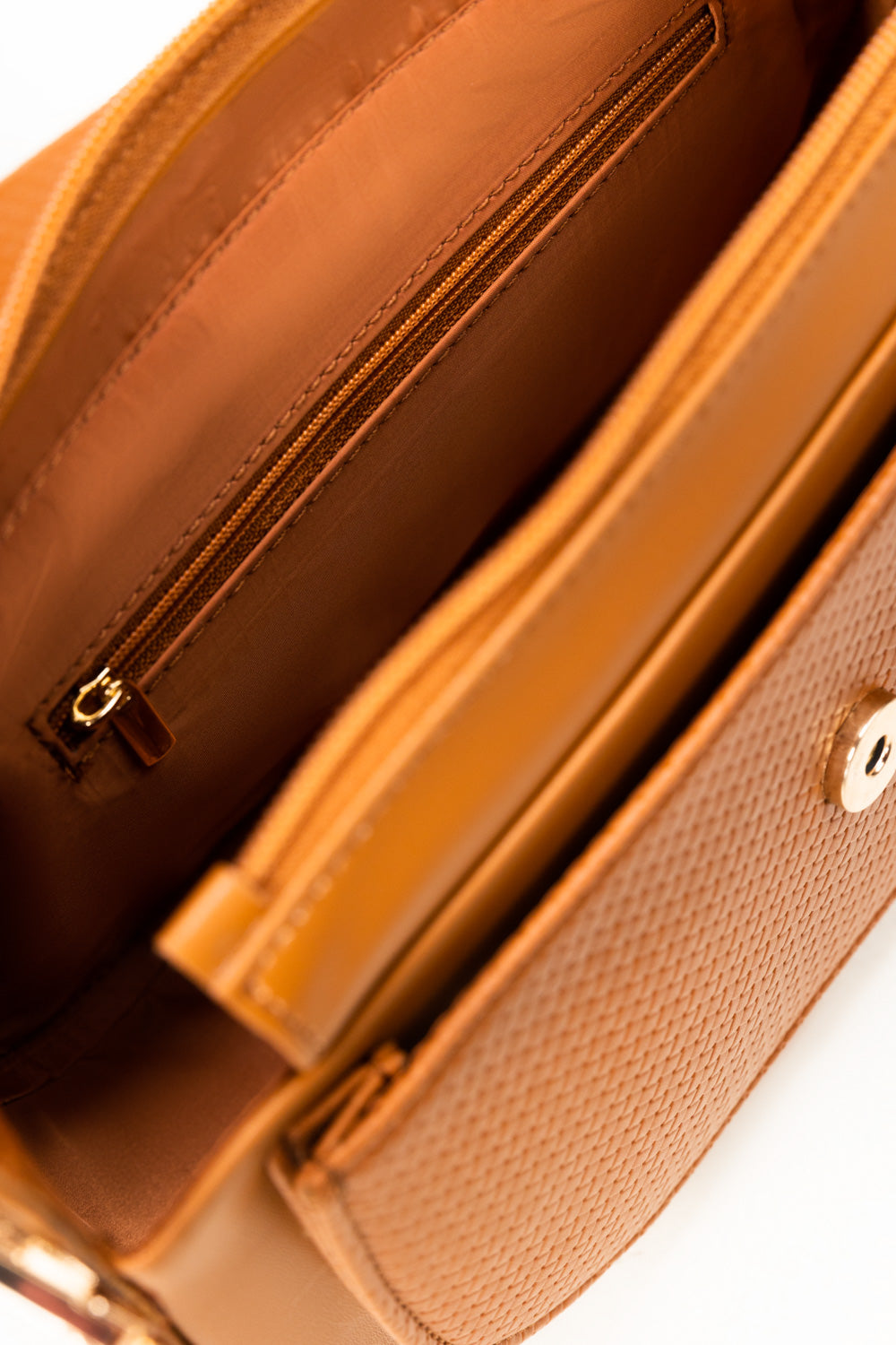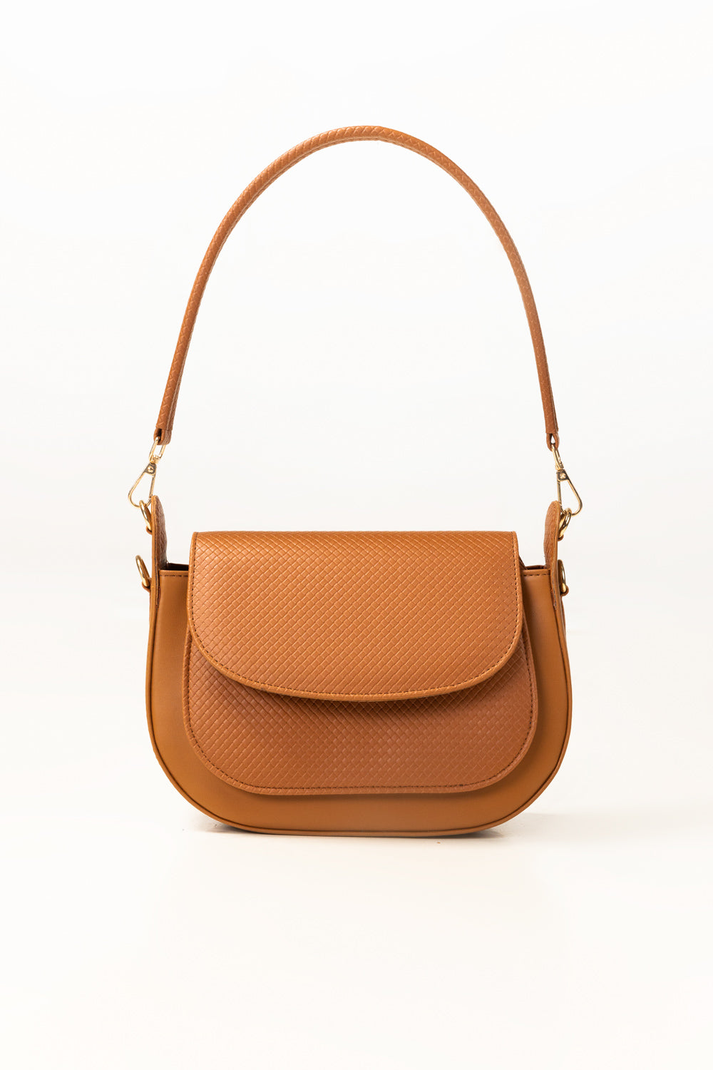 This elegant bag features a rich tan finish with a subtle textured flap that adds a refined, modern touch. Designed with a structured silhouette and gold-tone hardware, it balances everyday practicality with polished style. The adjustable strap makes it perfect for day-to-night wear, carrying your essentials with effortless charm.