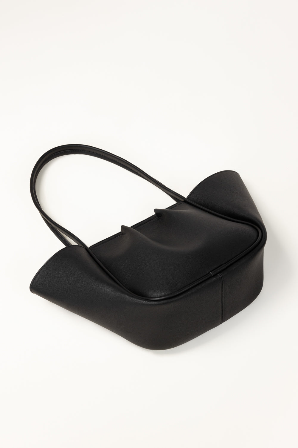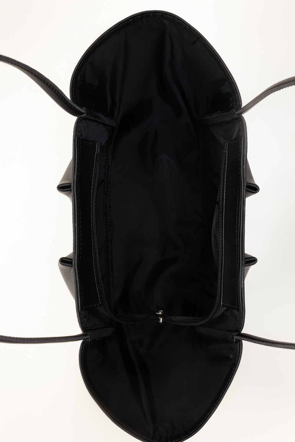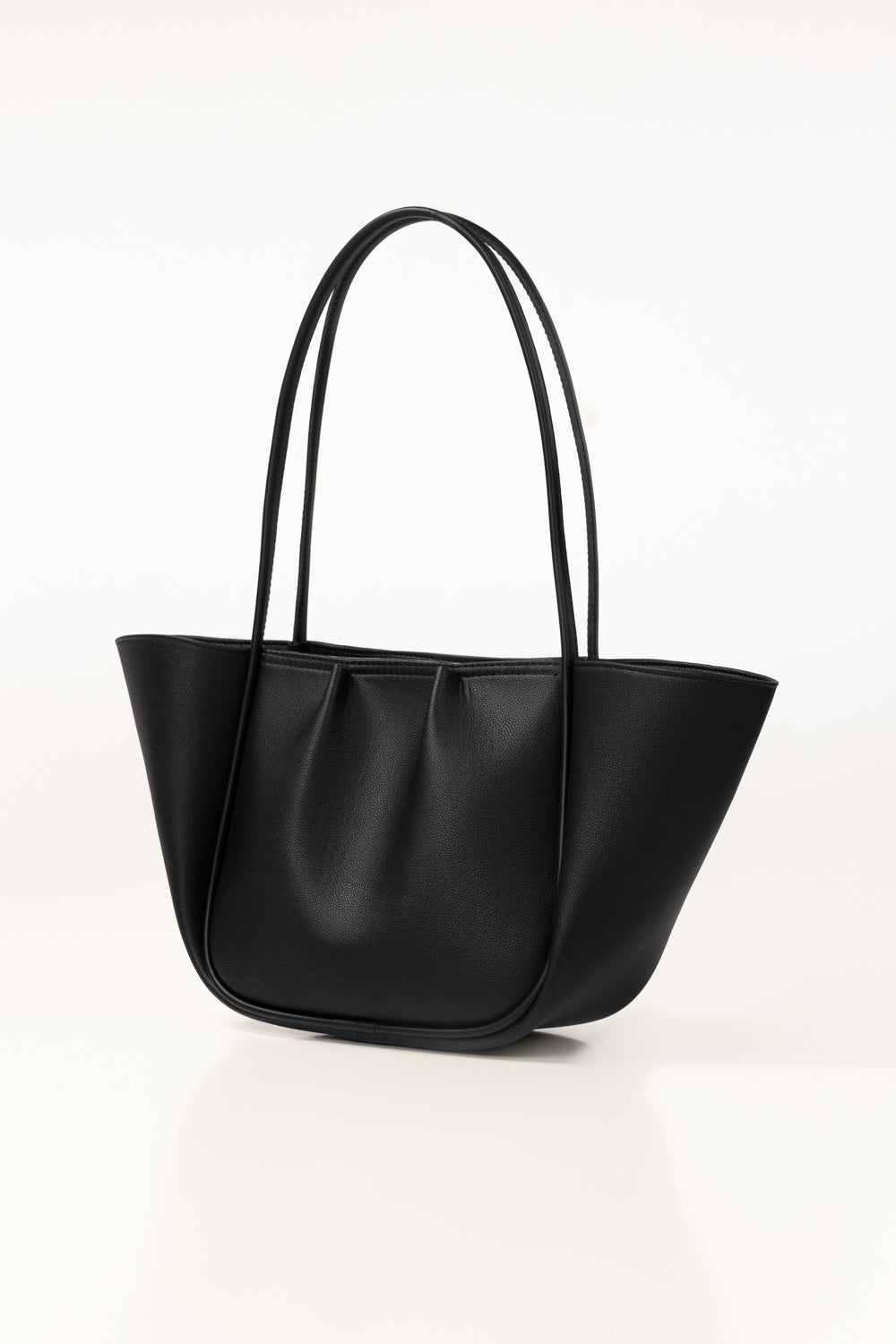 This elegant black tote bag features a structured silhouette with soft pleated detailing for a modern look, crafted from smooth faux leather with a spacious, fabric-lined interior and a secure zip pocket. Comfortable shoulder straps and a minimalist design make it ideal for everyday use, whether for work, shopping, or casual outings.