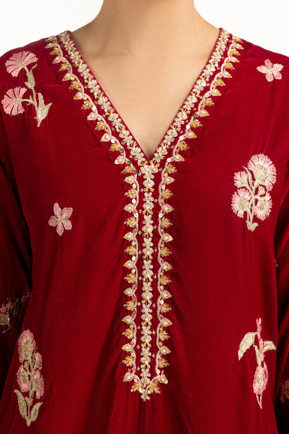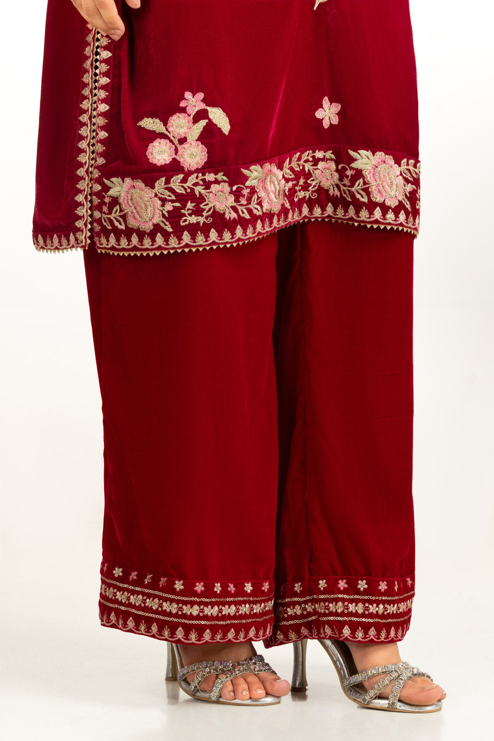 Get a vibrant festive look with this floral embroidered co-ord set in plush velvet featuring a hot pink color. Its regular fit flatters your frame while offering cozy comfort. Perfect for winter evenings when you want color and confidence in one outfit.