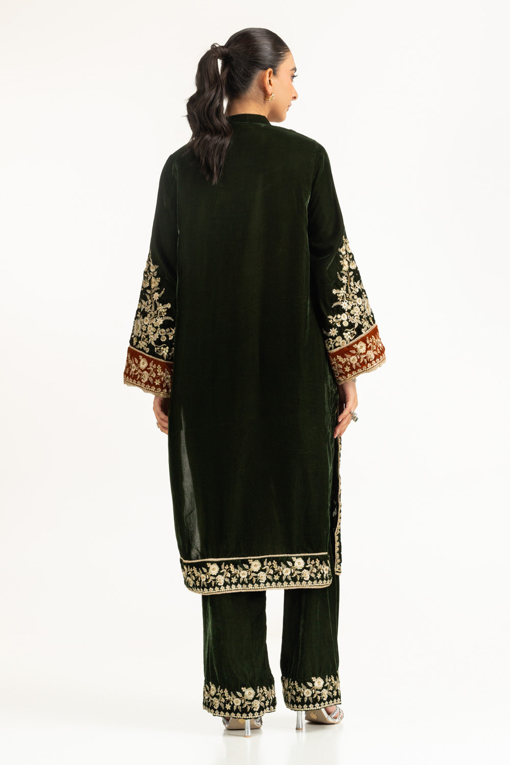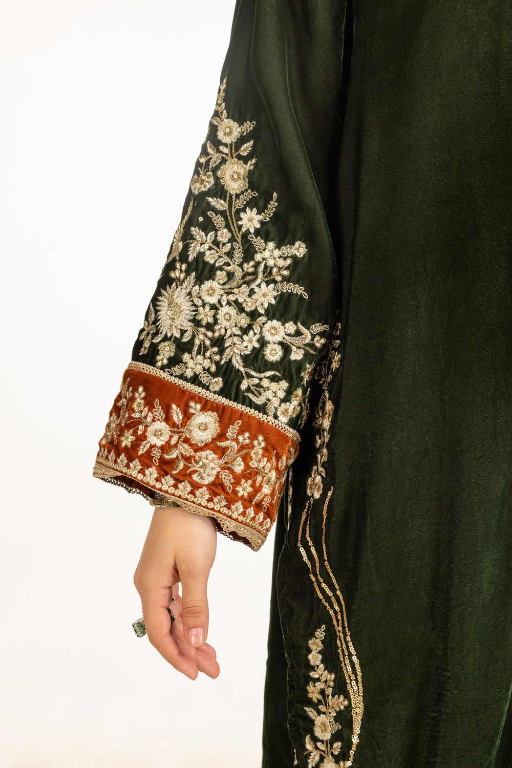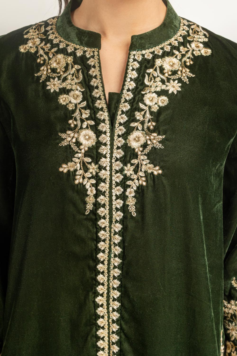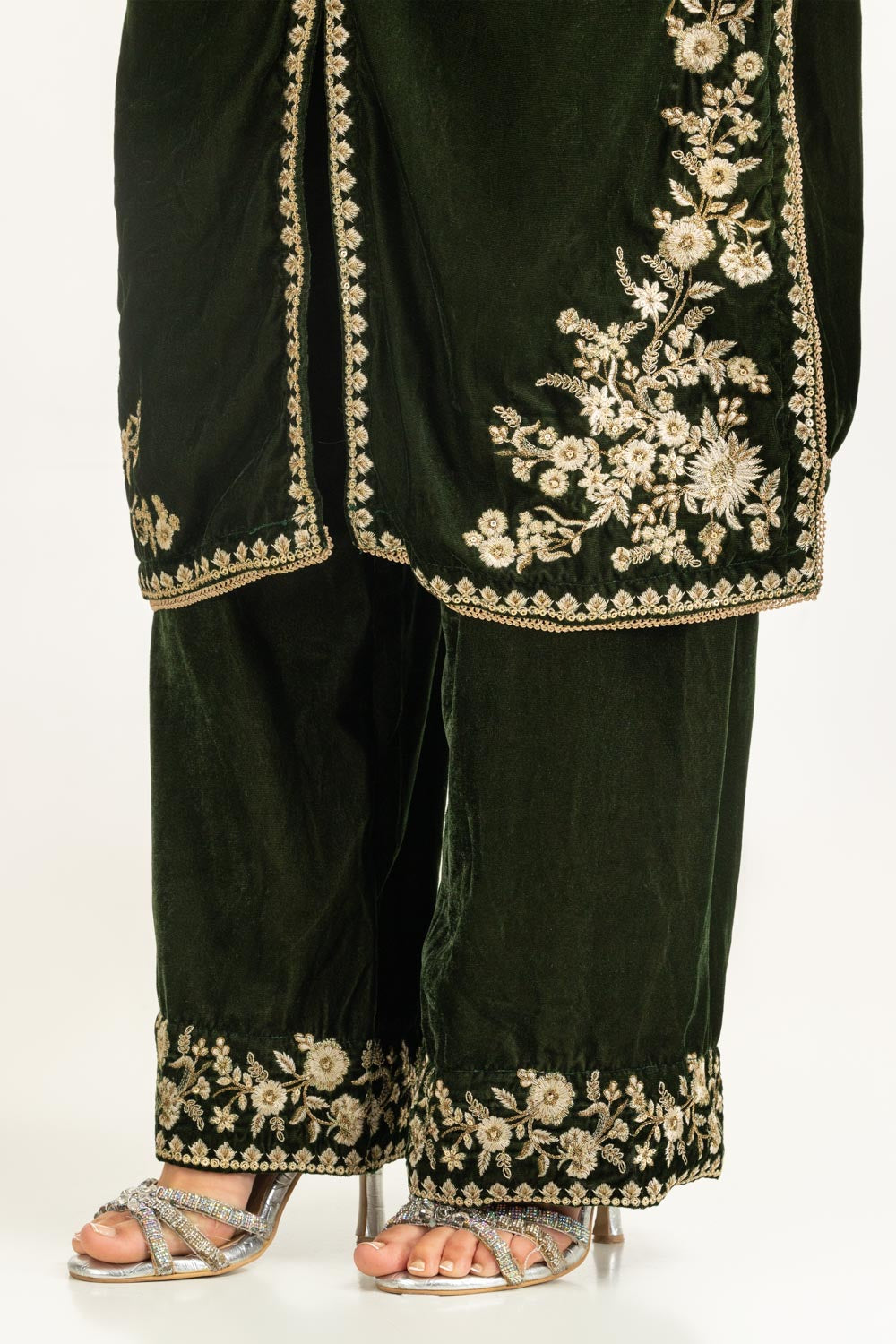 Get festive ready with this stunning velvet co-ord set in deep green, that brings a refined vibe through its rich gold embroidery and structured tailoring. The regular-fit flatters while offering easy wearability for winter festivities. Soft on the skin yet statement-worthy for celebratory moments.