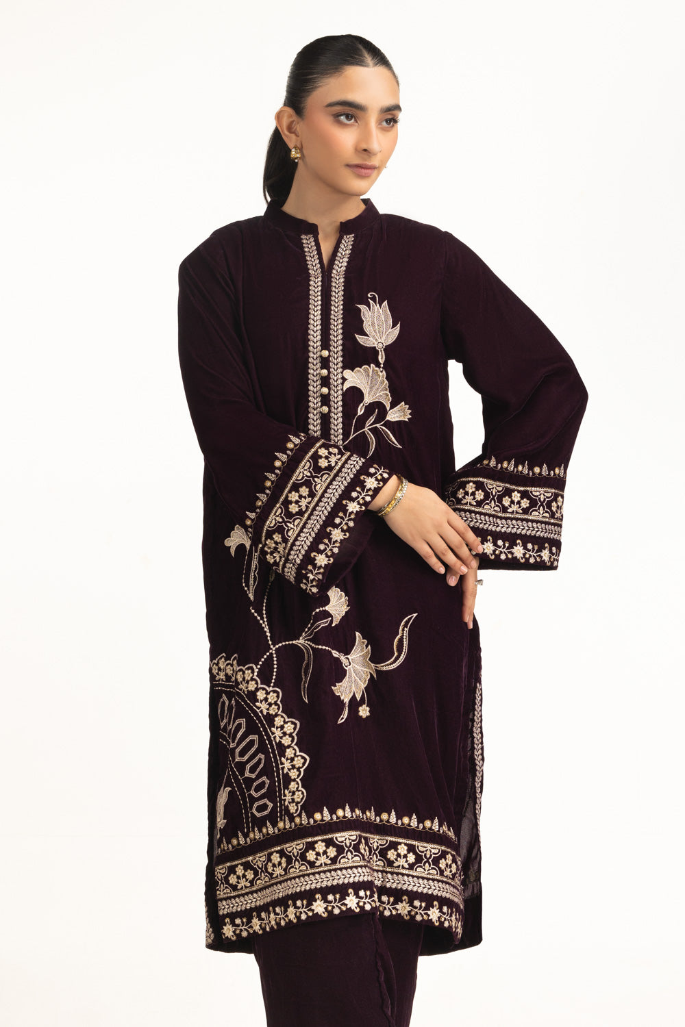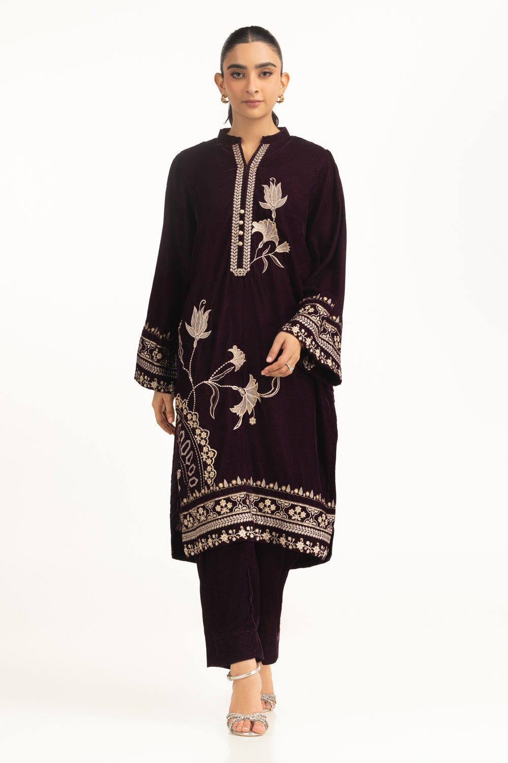 In rich purple hue, this embroidered co-ord set lends warmth and elegance to festive evenings. The regular fit maintains a polished silhouette, pairing easily with minimal accessories. A graceful pick for those who value comfort with tradition.