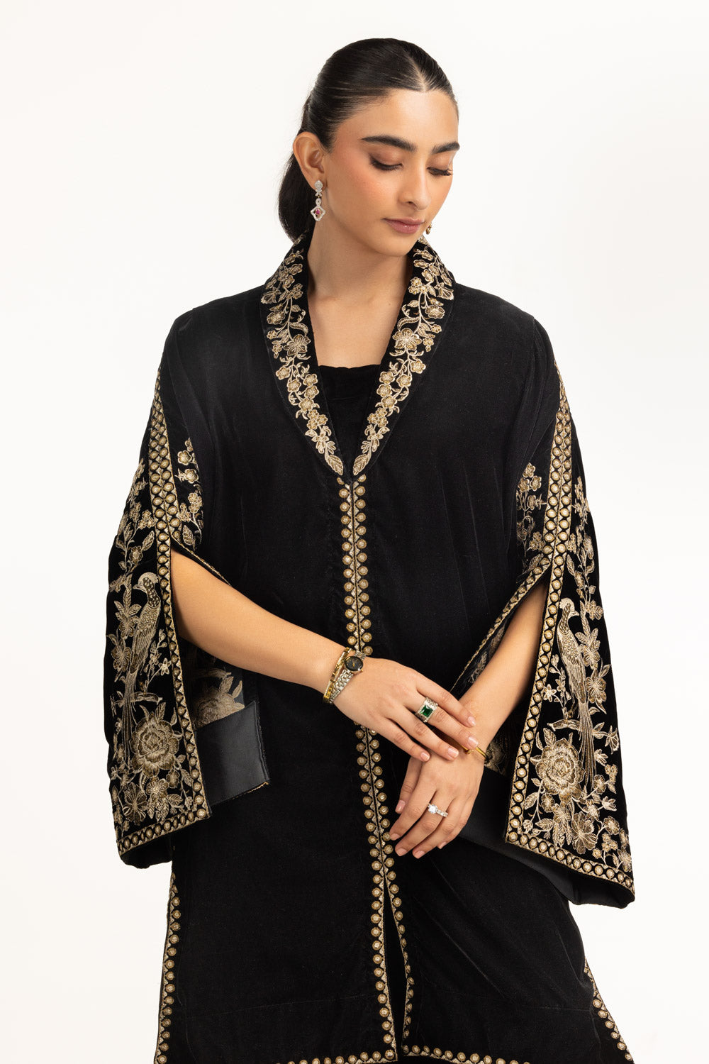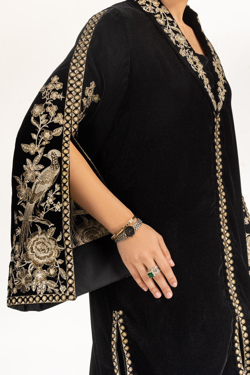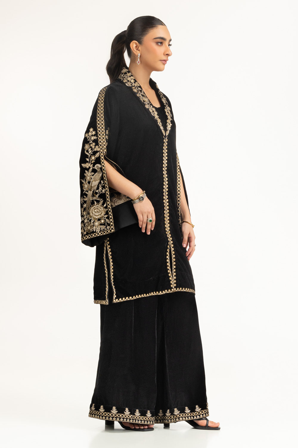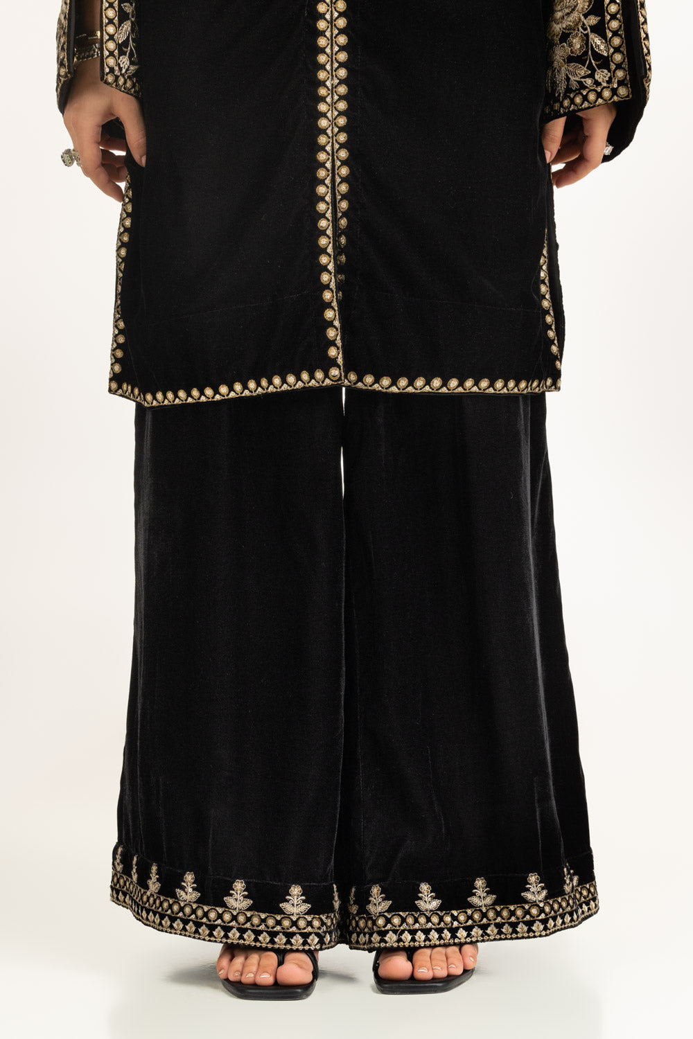 Made in plush velvet, this co-ord set in black carries intricate golden embroidery that adds quiet luxury to your festive outfit. The loose-fit makes it breathable and easy to style for winter occasions. Perfect for women who love relaxed, elegant looks.