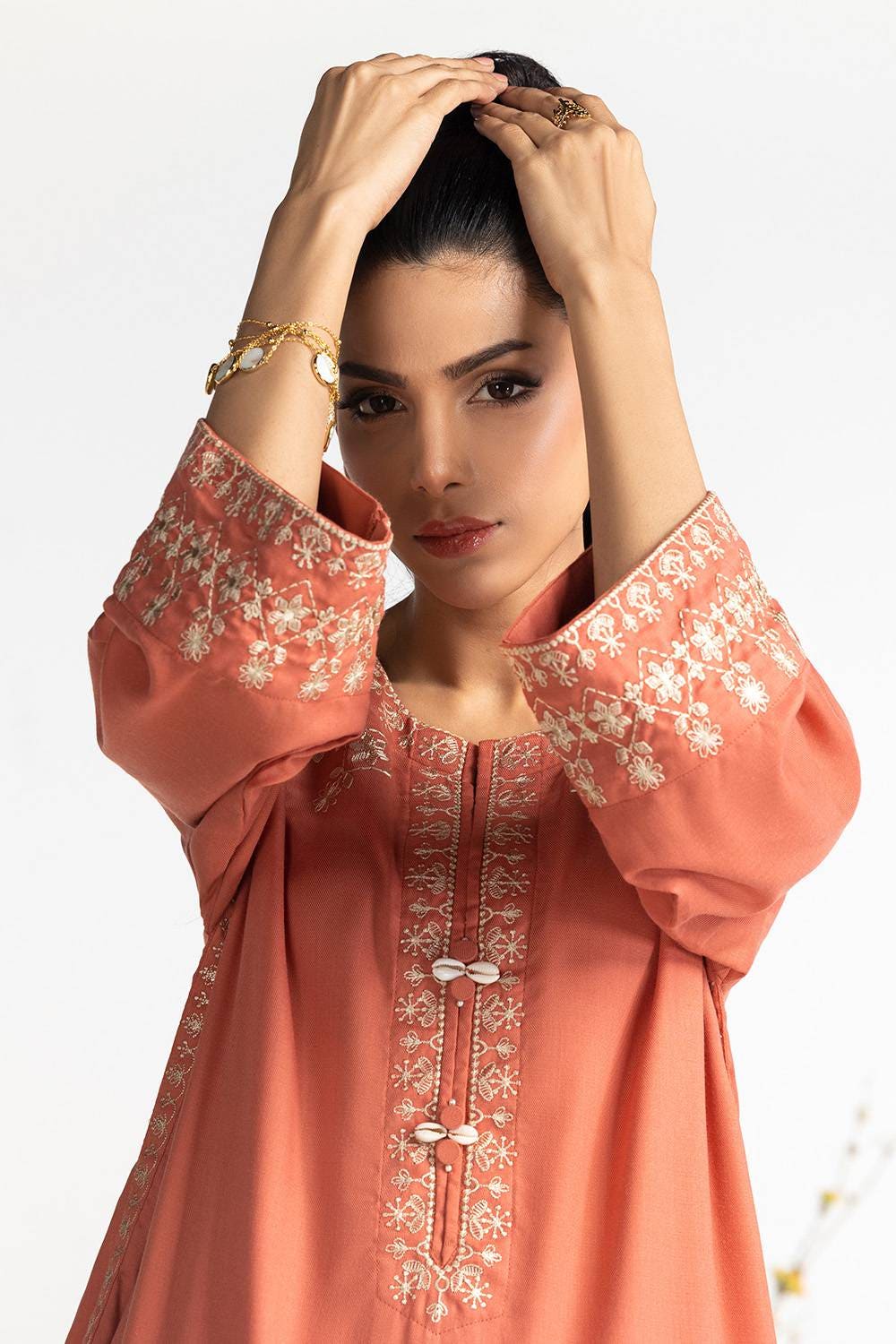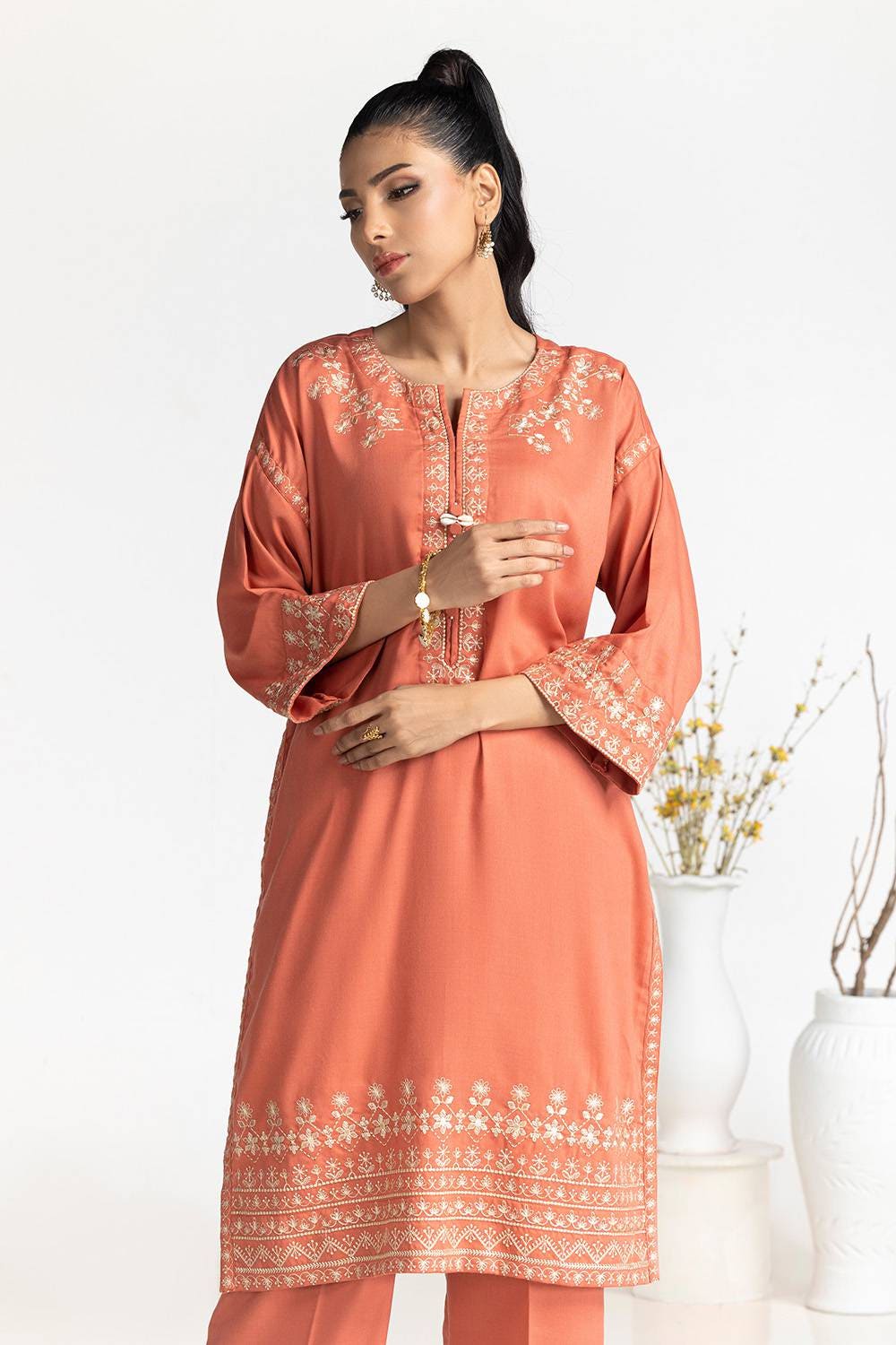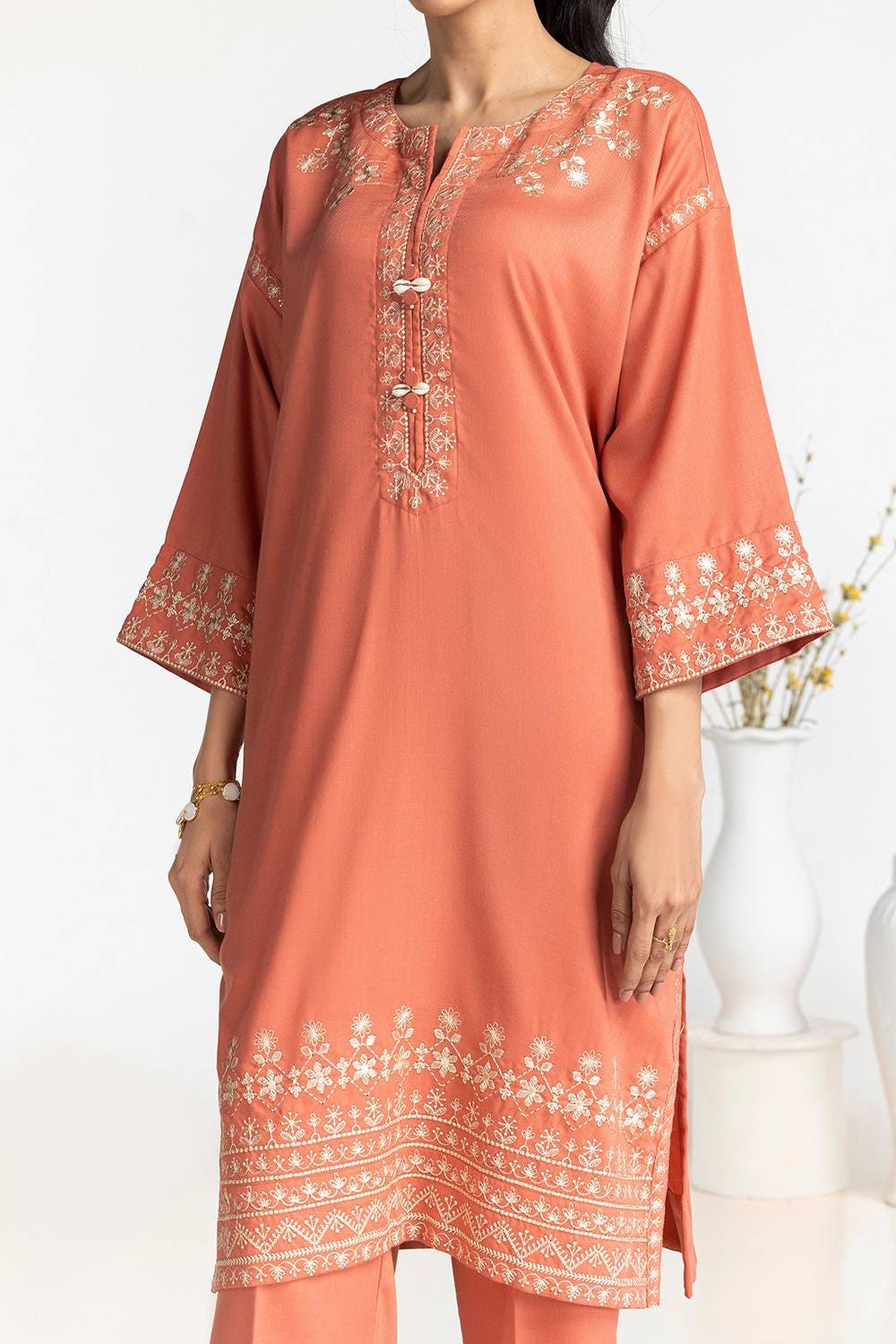 Ready to wear Step out in style with our peach viscose embroidered co-ord set, designed with a relaxed fit for all-day comfort. The intricate embroidery adds a touch of charm, making it perfect for both casual and semi-formal occasions.