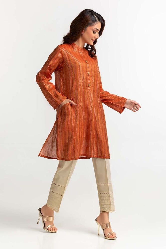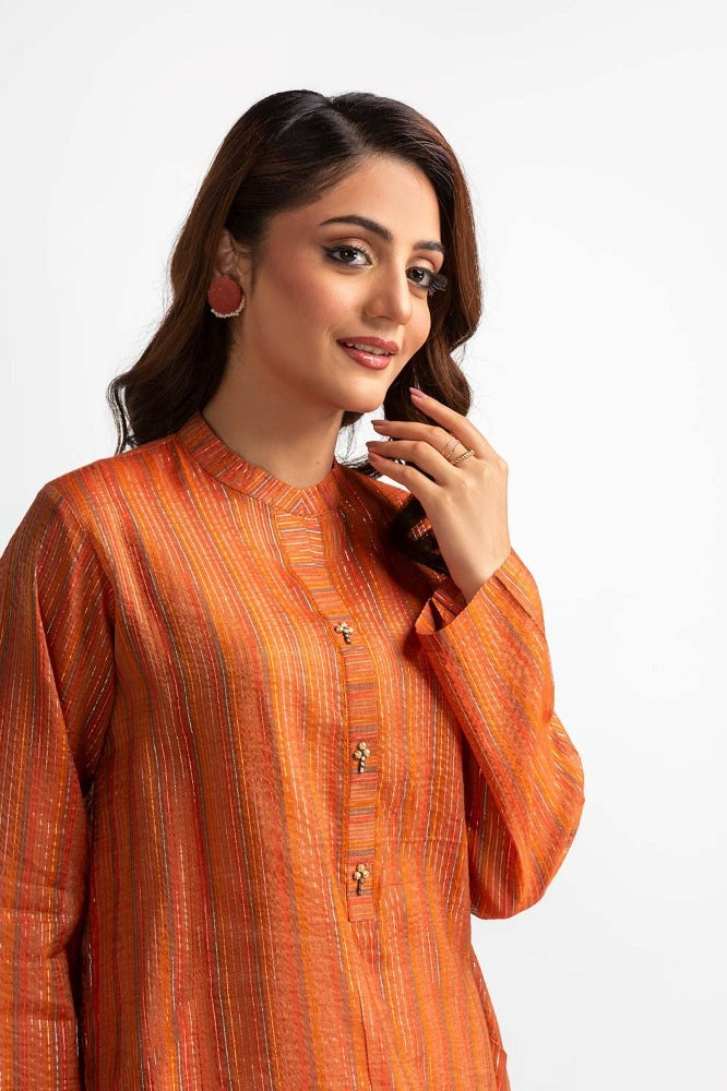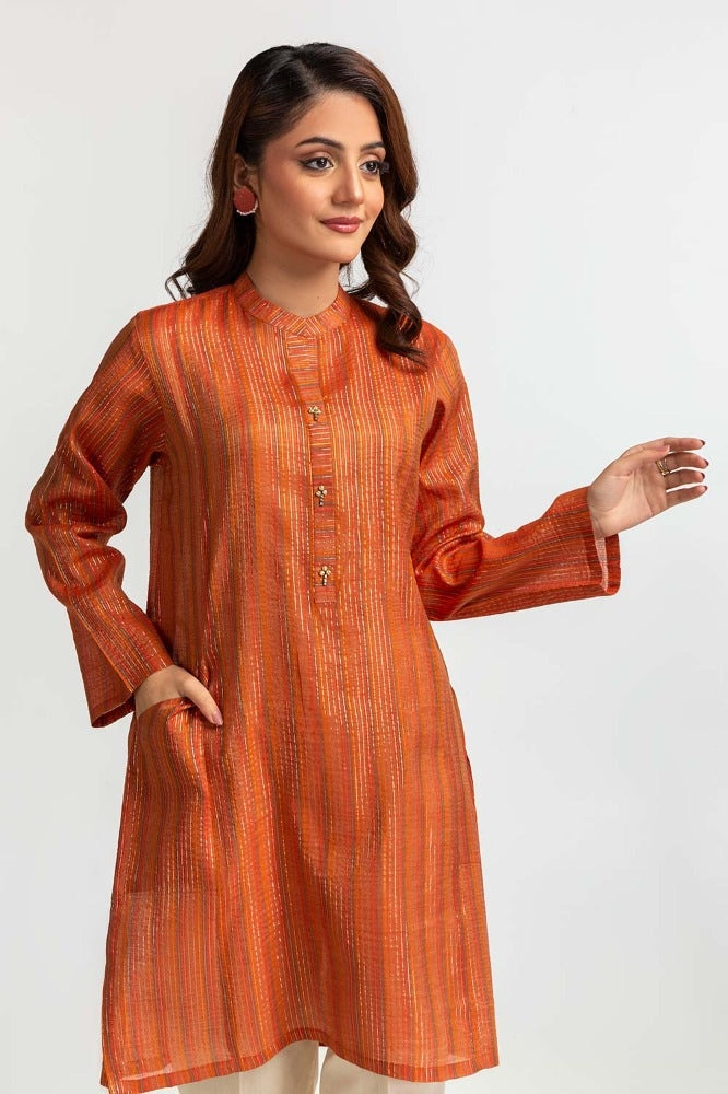 Ready to wear This rust-yarn-dyed embellished shirt adds an edgy yet sophisticated touch to your everyday style. The shirt features a simple round collar and beautiful embellishments on the placket to bring  a casual look.